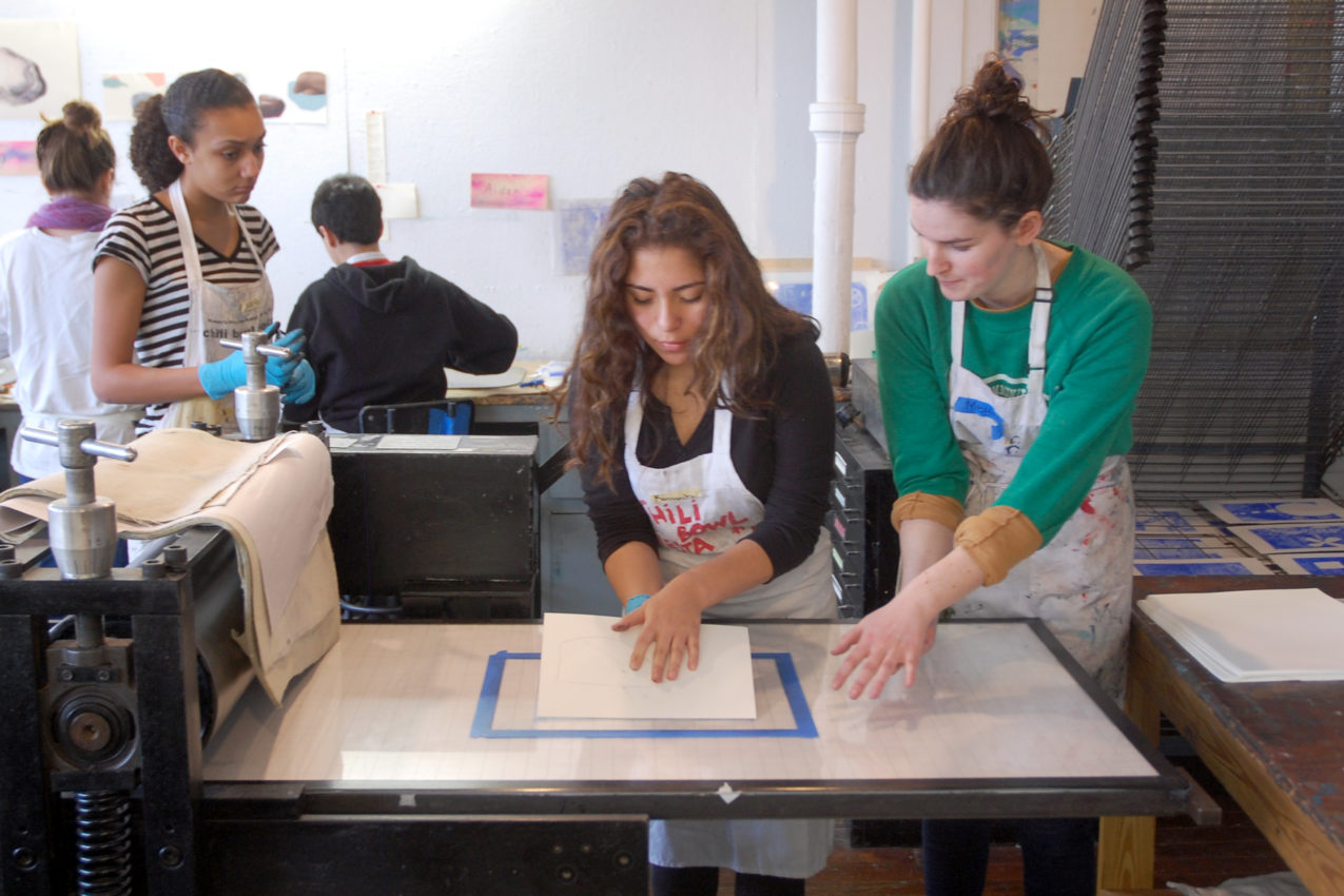 - Art-in-Ed resident Megan Duffy assists an eighth grader on the etching press.