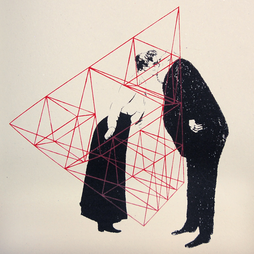 To achieve this using silkscreen printing, Phylly sketches the figures and kite from the photograph, digitally alters the sketch, then makes it into two screens. She discards the picture’s background and separates the grainy, hand drawn figures from the kite through color and style. The geometric layers printed over the figural forms visually mimic how Phylly imposes a narrative structure on historical coincidences.