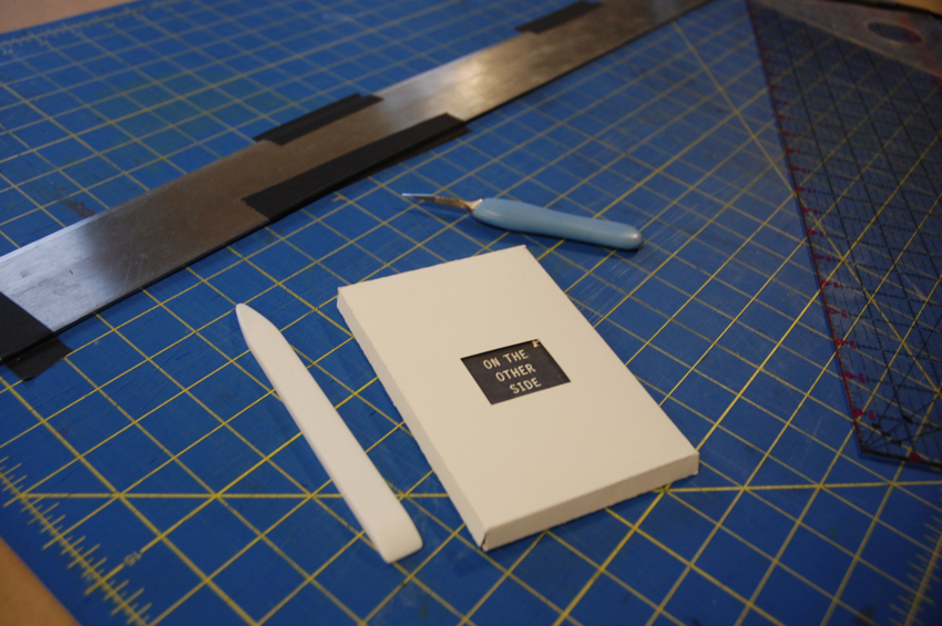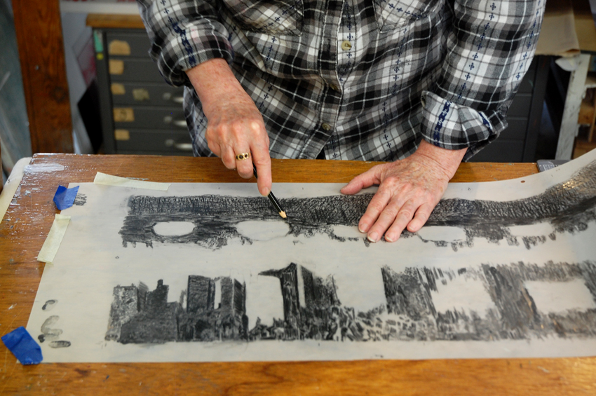 A shadowy skyline looms in the stack of long, double-sided prints Patty Smith and Claire Fouquet have pulled. As if we were driving into a new city for the first time, strange buildings fade into a hazy sky and skip around broken terrain. When these prints are cut and folded into Patty and Claire’s book, On the Other Side, we find this view no less mysterious when punctuated with creases of an accordion binding.