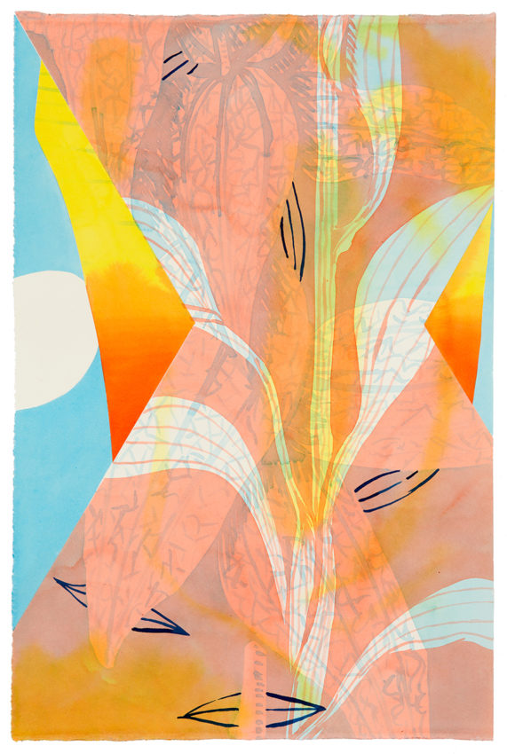 For years, I’ve included organic forms and imagery in my visual worlds, often in relationship with images referencing technology. With Ghost Prairie, a 40-foot modular landscape painting first installed in my new home state of Iowa last year (2016), Native American prairie plants became central characters. After years of living in the Northeast, my encounters with the expanse of land in the Midwest has definitely impacted me and my work. I learned that Iowa is perhaps the most radically altered ecosystem in North America and wanted to make something connected to this particular place. I began researching and responding to colonial and industrial American history, and its aftermath. I wanted Ghost Prairie to evoke the simultaneous presence and absence of that which has been displaced or forgotten since the early 19th century, and the prairie plants became the central metaphor in my telling of that story.
