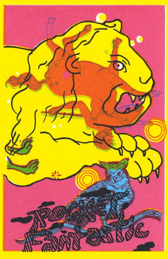 February 14, 2017In her Iowa City studio, Jen P. Harris builds iconographic, contemporary mosaics with ink and wood, but when she arrived in WSW’s silkscreen studio in 2012, she had a very different type of project in mind. American poet Gabrielle Calvocoressi had invited her to design and edition a poster series for the fictional psychedelic rock band Rocket Fantastic, one of Calvocoressi’s literary creations.