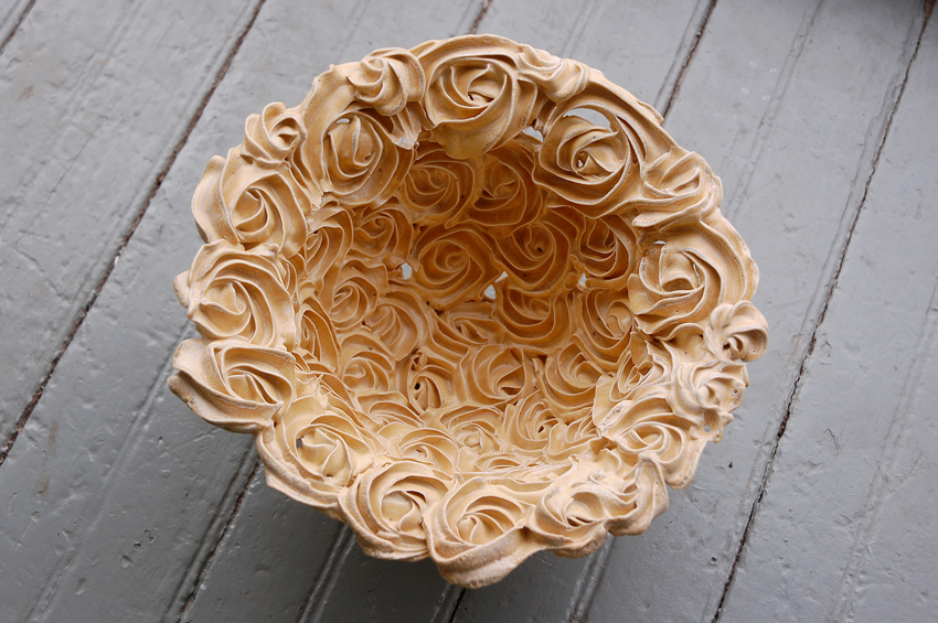 In Mexico, I was trying to repeat the 3D ceramic printing process. First, I filled bags with slip and tried to build up walls on a slab, but the process took a very long time. I went to a bakery supply store to buy piping bags used for frosting and brought them here without any experience. A lot of my first tests broke, but I finally have a few pieces that I really like.