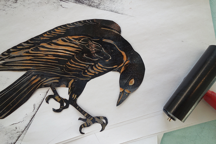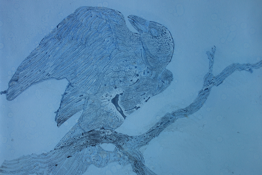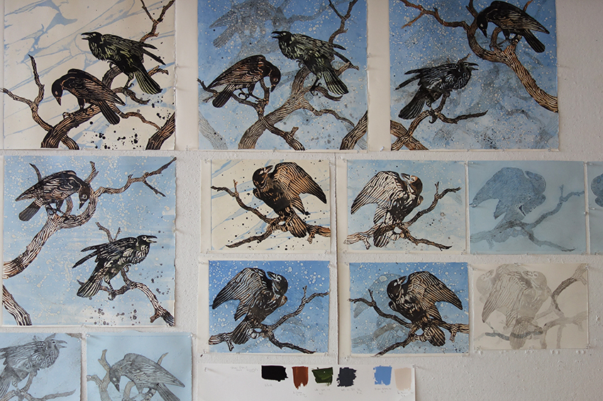 Crows, octopi, and eels look down from etching studio walls. Each one comes from a Mylar cutout that has been incised with detail, layered with ink, and run through the press on a Plexiglas plate. The textured backgrounds are created with newsprint, a happy accident Studio Workspace Resident Susan Amons discovered years ago when she over-inked a plate.