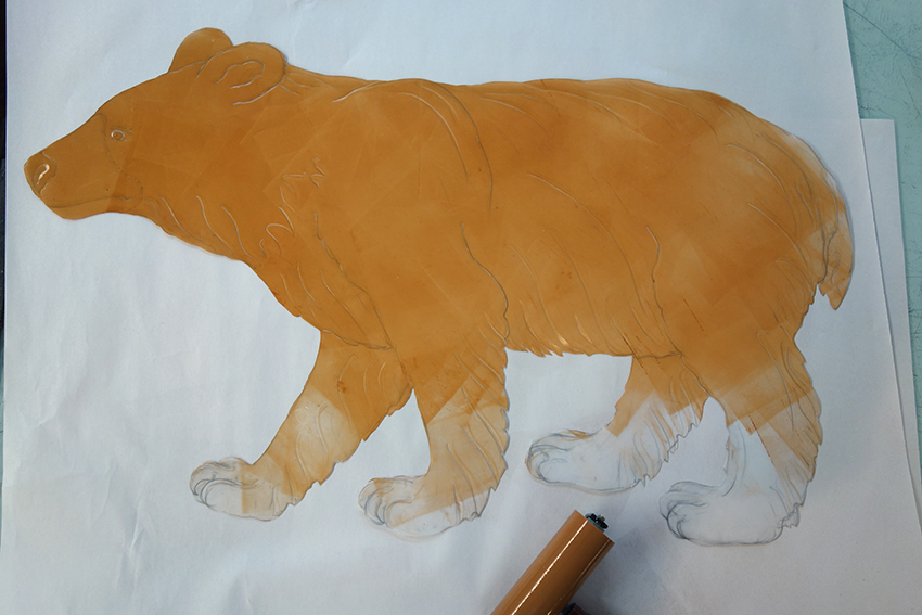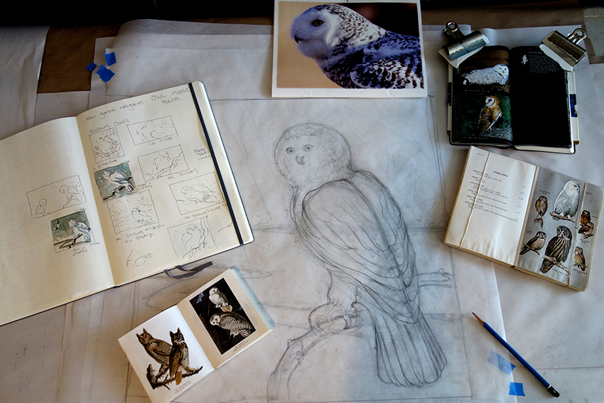 When her work dries, Susan keeps everything—ink tests, photographs, cutouts, and sketches—for her growing archive. In the last prints pulled, birds, bears, owls and their habitats fade away into ghosts, hopefully to be revived on the press again. Drawing from the shrinking American wilderness, Susan preserves these animal as a perfect dream, a collective memory to keep close and protect.