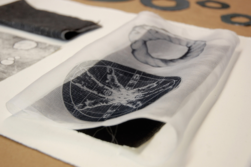 I’m concerned about making reproductions of an object with the object itself, the actual handkerchief becomes the printer’s plate and then I work the printed gampi paper until it’s nearly cloth-like too. As a sculptor, perhaps this is my way of translating printmaking into moldmaking. Additionally, most of the prints I’ve made with this cloth use ink made with graphite powder as a nod to the practice of photorealistic drawing. There are artists who work with reproductions in a way that makes sense of their practice, like Vija Celmins’ disorienting simulations, or Eva Hesse’s but what these prints need is another element that hasn’t revealed itself to me just yet. I think that they will operate as pieces within a larger context, but will need to juxtapose the precious quality of the original’s impossibly fine handiwork. I’m looking for a glitch to exploit.