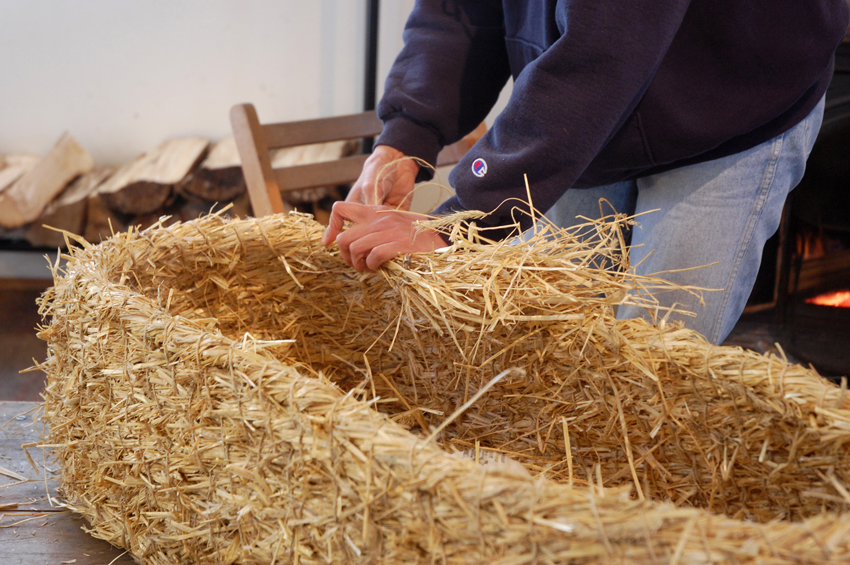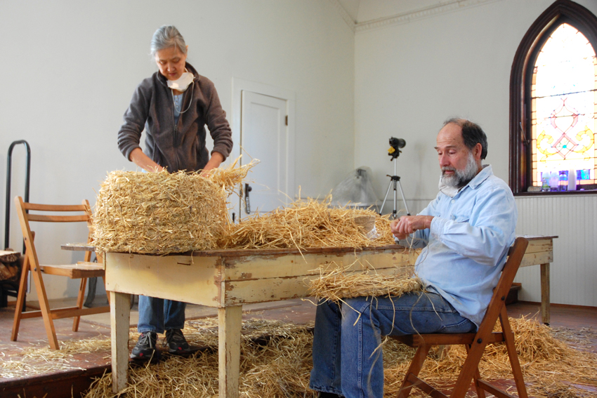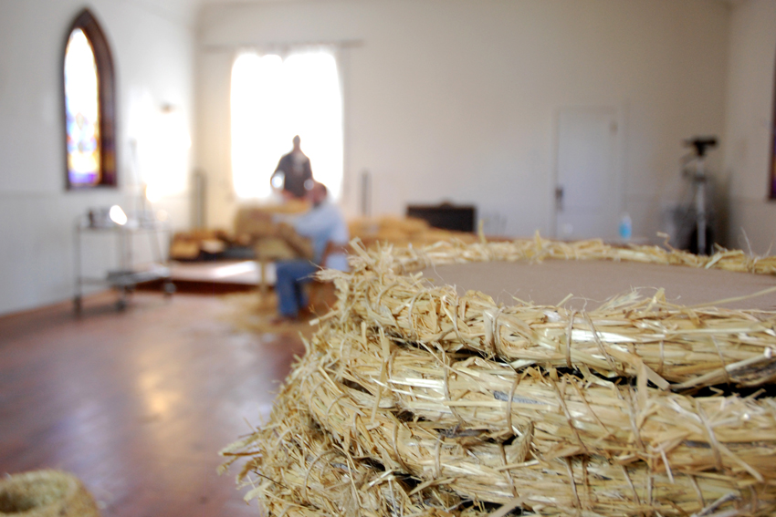 Three weeks ago, Mei-ling and David set up shop in the CHRCH Project Space with hay bales and a stack of cardboard. From the board they cut twenty-three circles and five oblongs which form the bases of each vessel. Sitting at the apse of the Dutch Reform church-turned-art space, they hand-wove twine through coiled hay using tweezers as sewing needles. As they worked, they described that during a similar project in North Carolina, a hardy garlic chive plant long outlived the hay vessel, leaving a knotted, sculptural mound of roots in its wake.