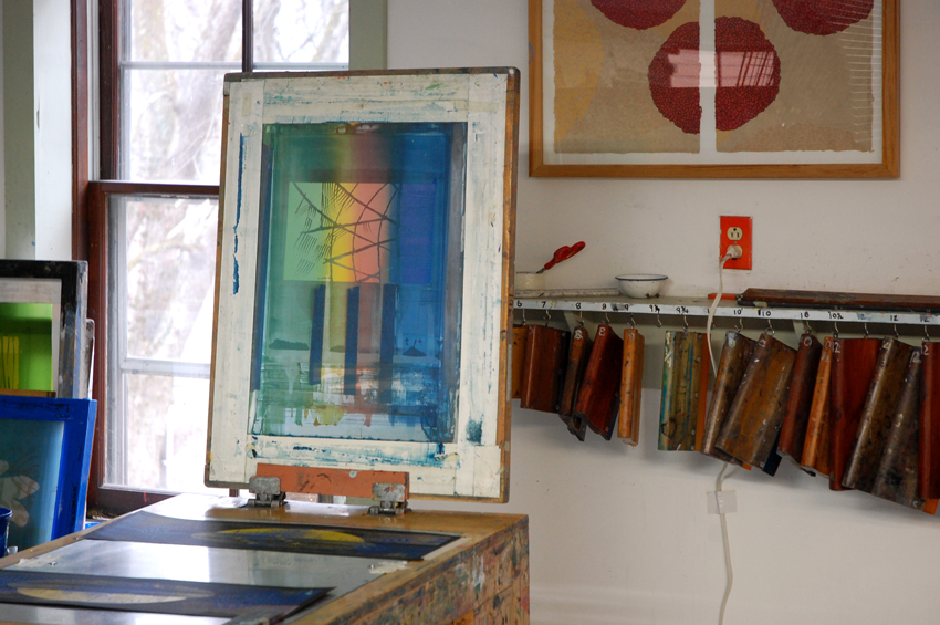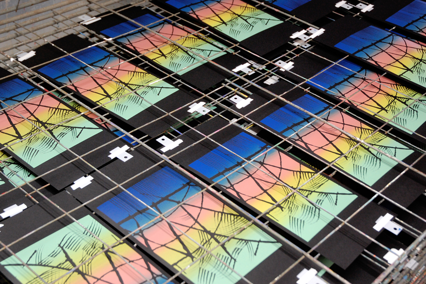 For the final print, Veronica reversed the rigid order of the book, running four inks together into a gradient. A split fountain print, it is as technically demanding as the grids which make up the previous pages. All four colors were carefully pulled in the same pass and on the same screen, flowing together as though these imaginary spaces were suddenly washed away.
