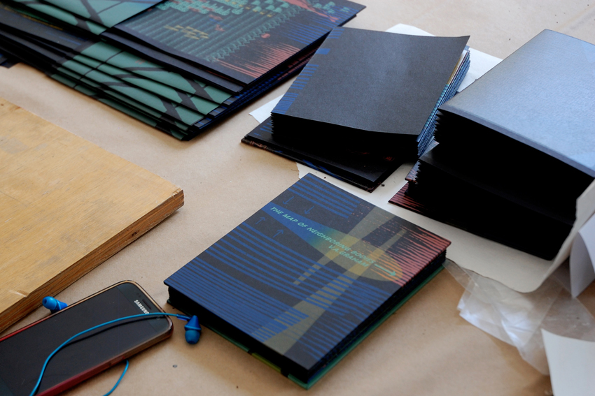 The accordion binding and block-like designs are a nod to vintage video games where players were suspended between the physical world and a scrolling, distorted digital adventure. Veronica explains, “For our generation, for me, video games were my first way of experiencing a new space, and it was in a rapid and compressed way. They were completely fictional spaces and we could jump in and out of these worlds.”