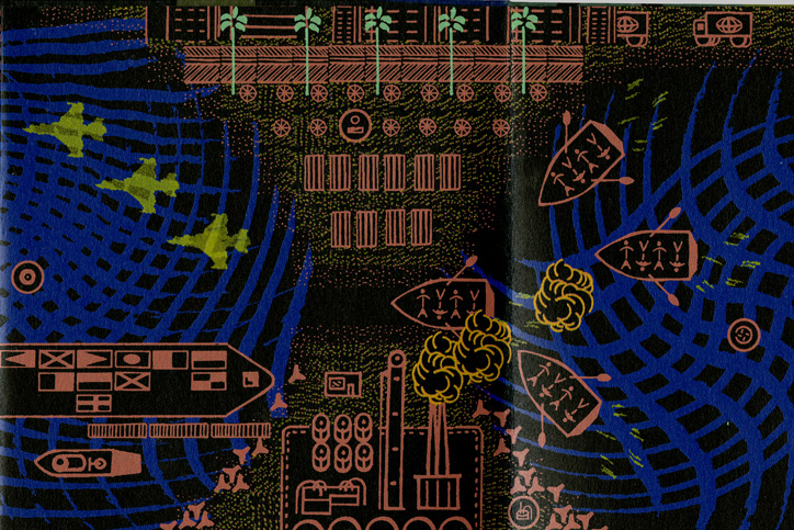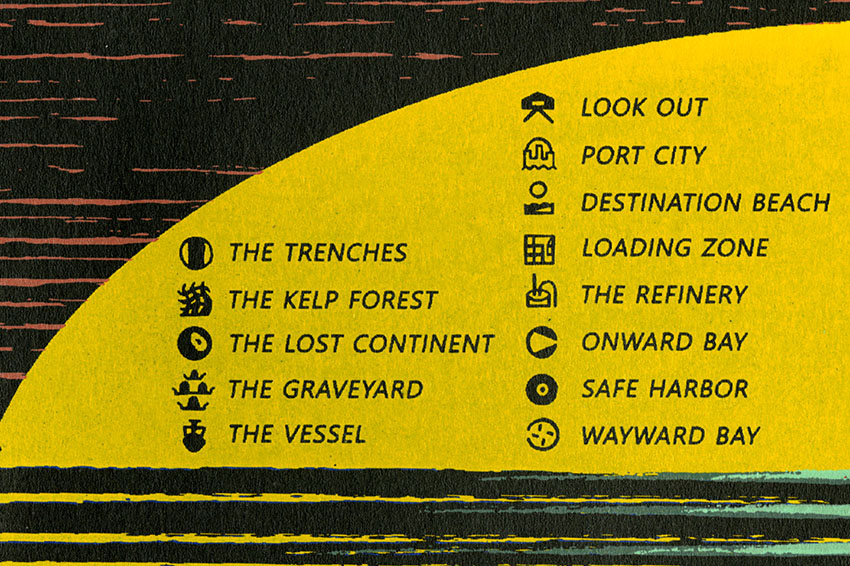 Using a sunset key in the front of the book, readers can decode The Map of Neighboring Bodies and find what a fictional population has regulated, traversed, commodified, and abandoned across a continuous seascape. However, this invented space offers a condensed reflection of reality. Each space was designed after months of research—or, as Veronica says, “Many, many trips to the library”—on topics ranging from ancient cartography to American maps to sunken vessels. She dismantled, categorized, and converted her findings into pictograms, then drew her own boundaries onto the world.