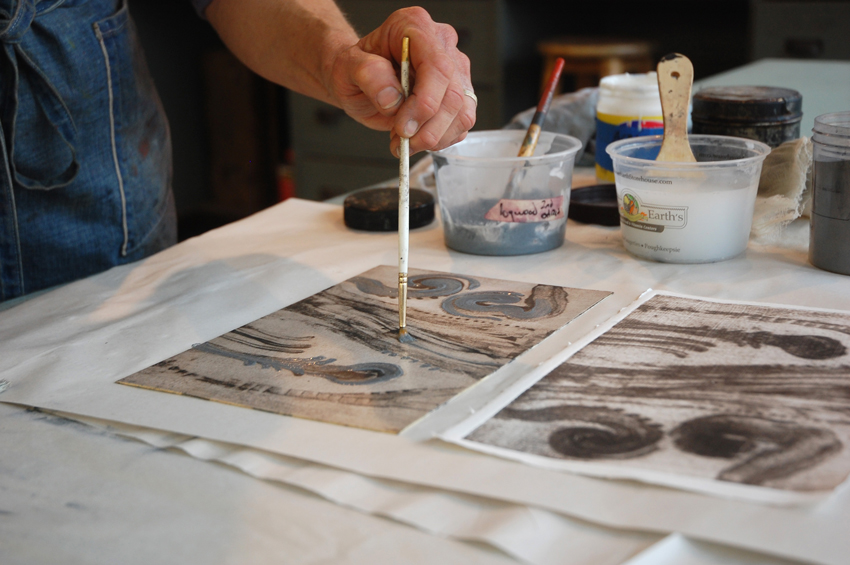 In the WSW etching studio, Jen arrived with copper plates to continue this line of imagery, but quickly changed direction and materials. After finding a drawer full of the silicon powder carborundum she moved to making collagraphs, or relief prints, from items glued to a board, with chine-collé elements. Watching her piece together these different processes on the press, it’s interesting to know she was once a production printer (who later became a jewelry artist before making her way back to printmaking). At the moment, Jen doesn’t seem concerned with editions; each of her prints are unique.