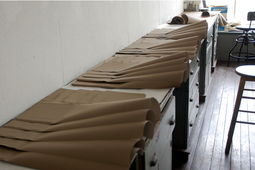 In the studio, surrounded by stacks of cover board and book cloth, Leah describes her first encounter with the text. “I read Bell’s responses as a brusque bravado— that he didn’t feel the need to answer the questions. He intentionally, maybe aggressively, refused to participate in the interview with this masculine ego associated with the history of Minimalism. Men would both strip space and take up space with large-scale installations.”