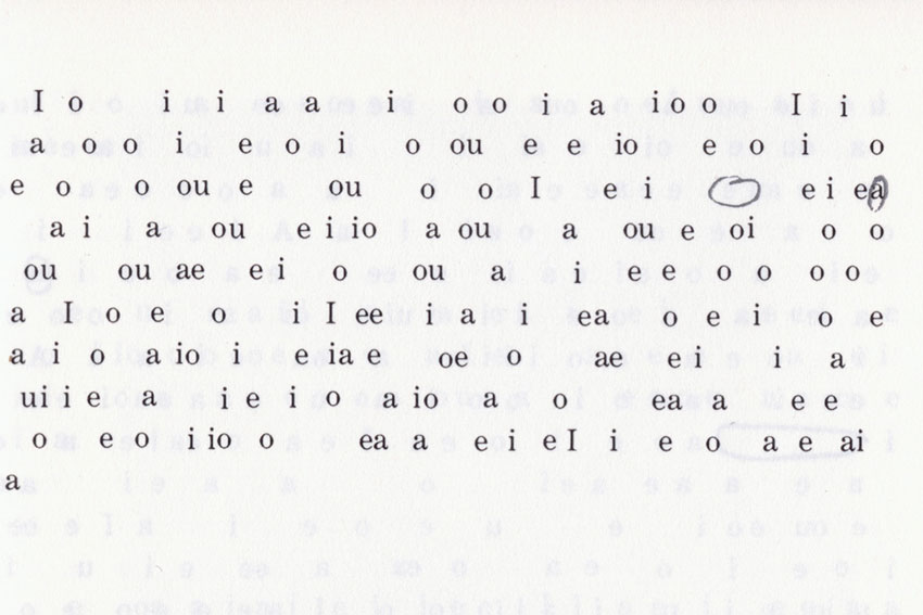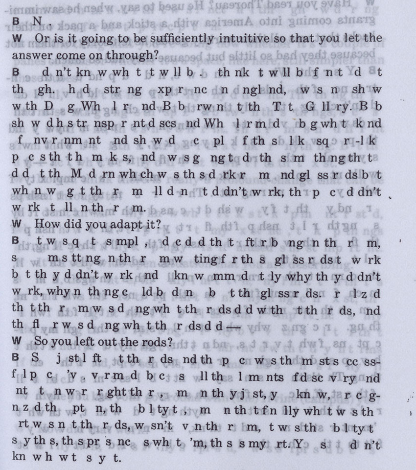 In the stacks of Pittsburgh’s Carnegie Library, Artist’s Book Grant resident Leah Mackin happened upon the catalog for the 1971 West Coast Minimalist exhibition, Transparency, Reflection, Light, Space. An enclosed interview with Larry Bell caught her attention; Bell’s answers held spaces where vowels should have been and there was no context— nothing but a short editorial note—to explain why.