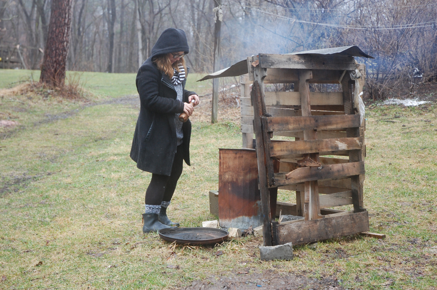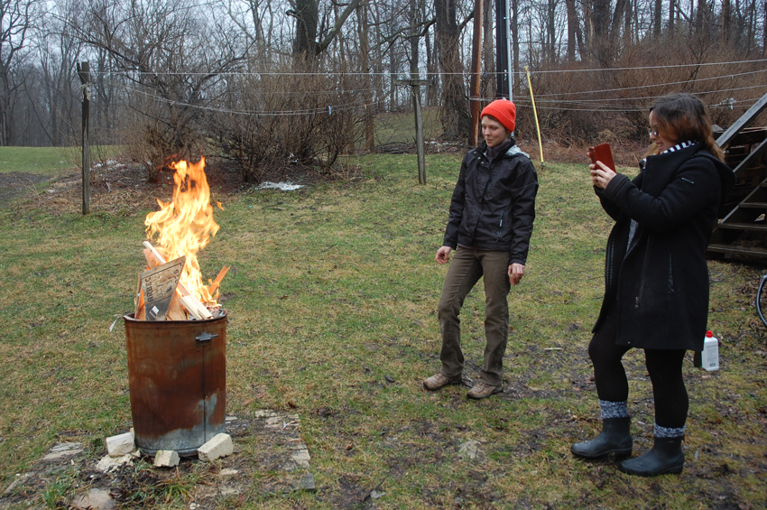 Following this line of thought, another project emerged during her residency. On the studio’s back porch, Rebecca’s sealing a subset of her bowls with a fine layer of encaustic wax. Unlike chili bowls, these will not be glazed or used for eating. They are barrel-fired, packed in burning coffee grounds, sawdust, and paper for a porous, smoky surface. Before the fire, Rebecca wrote onto slips of paper and placed them in each pot, some of which now bear a burned shadow of the process. As we watch wax melt and seal the finished bowls, we discuss writing, making, and performance in and outside the ceramics studio.