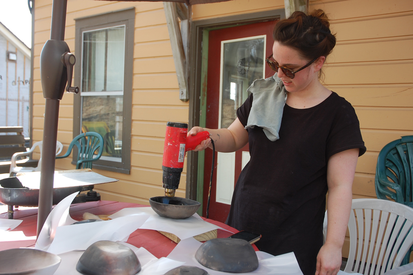Rebecca’s tablets begin as thin clay slabs pressed into molds, left to dry, then fired in the kiln. After she leaves her residency, she’ll finish them with a whiteboard surface paint and use them to lead a writing workshop at the Vancouver Art Book Fair. “I was originally going to call them ‘forgetting tablets,’” Rebecca says, but the name didn’t quite fit the concept. Instead, they invite writers to “empty their heads” as a daily ritual, and while Rebecca prepares the tablets she also works to make bowls for next year’s Chili Bowl Fiesta.