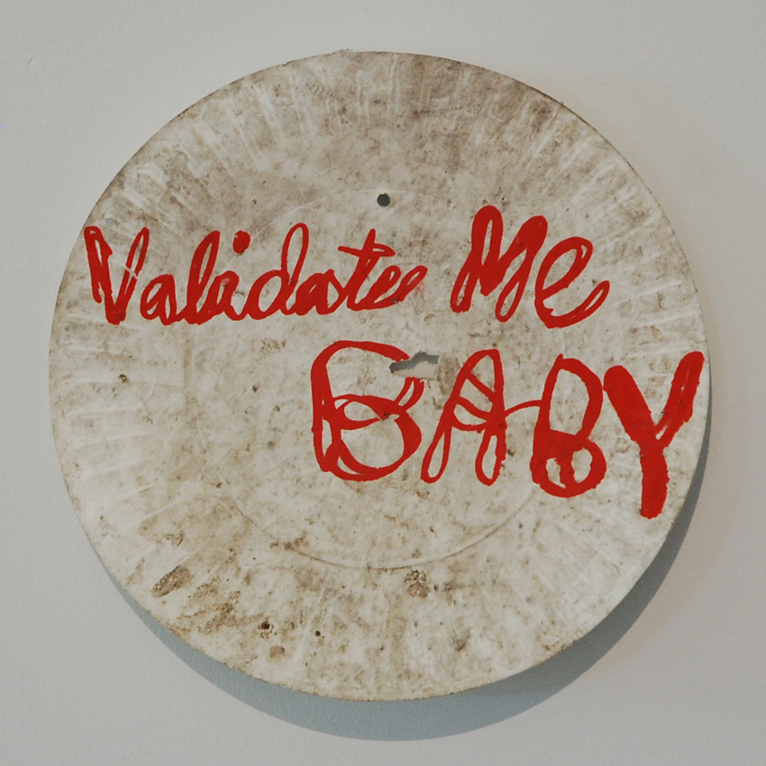 Using reclaimed litter, C.R. brings attention to the shared state of cognitive dissonance shrouded by today’s consumerist society. The mass daily accumulation of single-use objects—food containers, dryer sheets, and wristbands—and the collective agreement to forget them reappears throughout her work. She personifies objects by embroidering or screen printing dialogue fragments of rejection and abandonment.