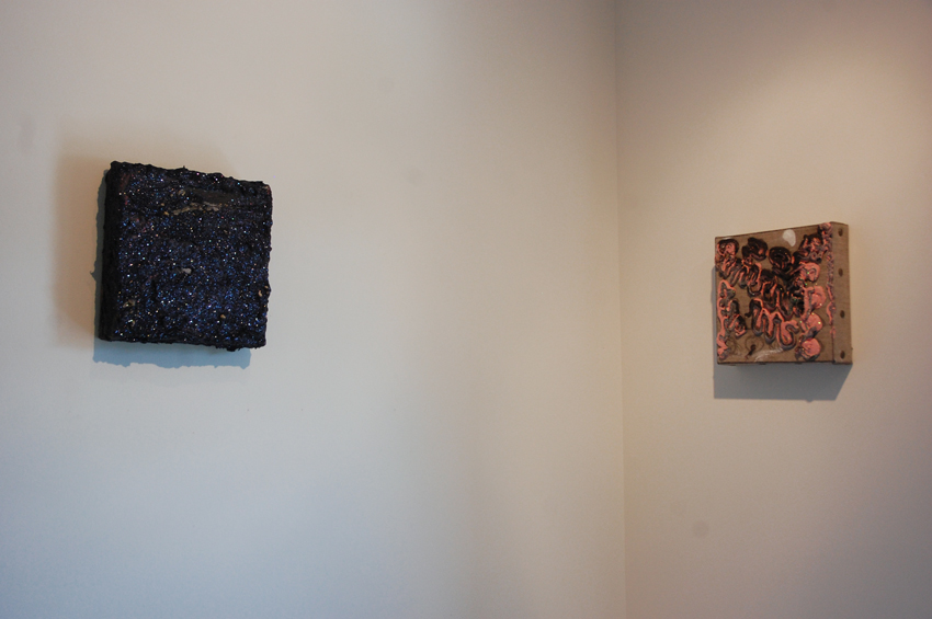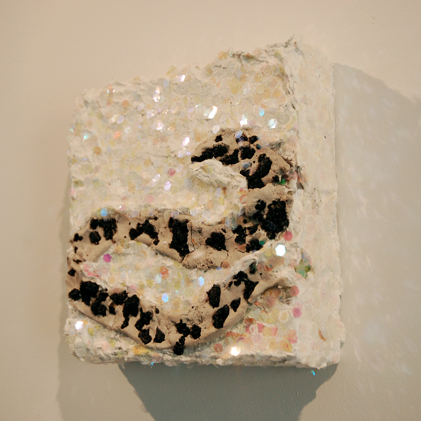 “You show up for work and there’s a studio that you can be in,” she says. “Having that every day for six months is not something that exists in the world.” Taking advantage of the time and space, she incorporated paper in her mixed media compositions. These consist of fine and found materials, including asphalt, joint compound, paper clay, expanding foam, and glitter. Drawing from philosopher Julia Kristeva’s treatise The Powers of Horror, Adreena looks for intersections of self and other, allure and repulsion, and the unintelligible and familiar in elevating alternative materials in her work.