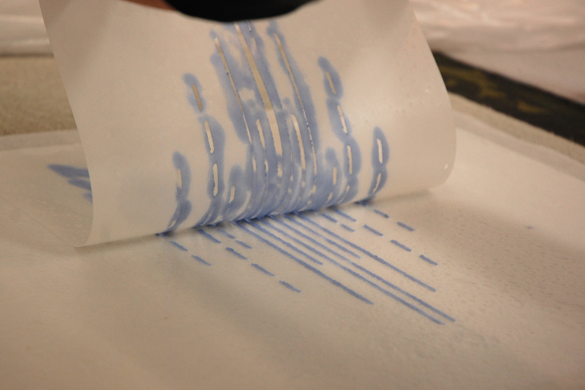 This new body of sculpture is nearly architectural, reminiscent of luminous stained glass—or another medium that captures and reveals the qualities of light and air—with red violet and golden hues. Tayo was raised surrounded by the tiled patterns and Roman ruins of Northern Africa and the textiles of West Africa. Color and space are rooted in her way of seeing the world, weighing heavily in the next steps moving forward. Toward the end of her residency, this meant stenciling saturated pulp paint onto fresh paper and wrapping sheets in different tints of blue around the form. When dried, cut, and reassembled, the depth of surface evokes another dimension in the work.