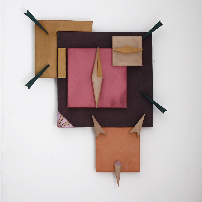 “I try to avoid narrative,” Tayo says, and instead opts for abstract geometric arrangements superimposed on loose, gestural washes of color. After participants of an artist critique at the BAU Institute suggested her newest body of sketches could exist in three dimensions, Tayo, who had continued working with handmade paper by creating an installation of windows, devised a way to construct polychromatic compositions like bas-relief.