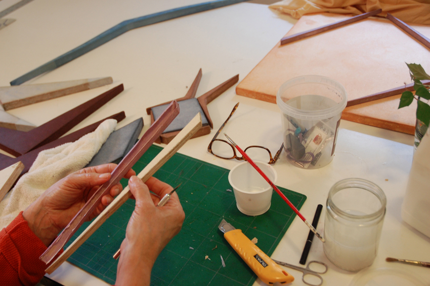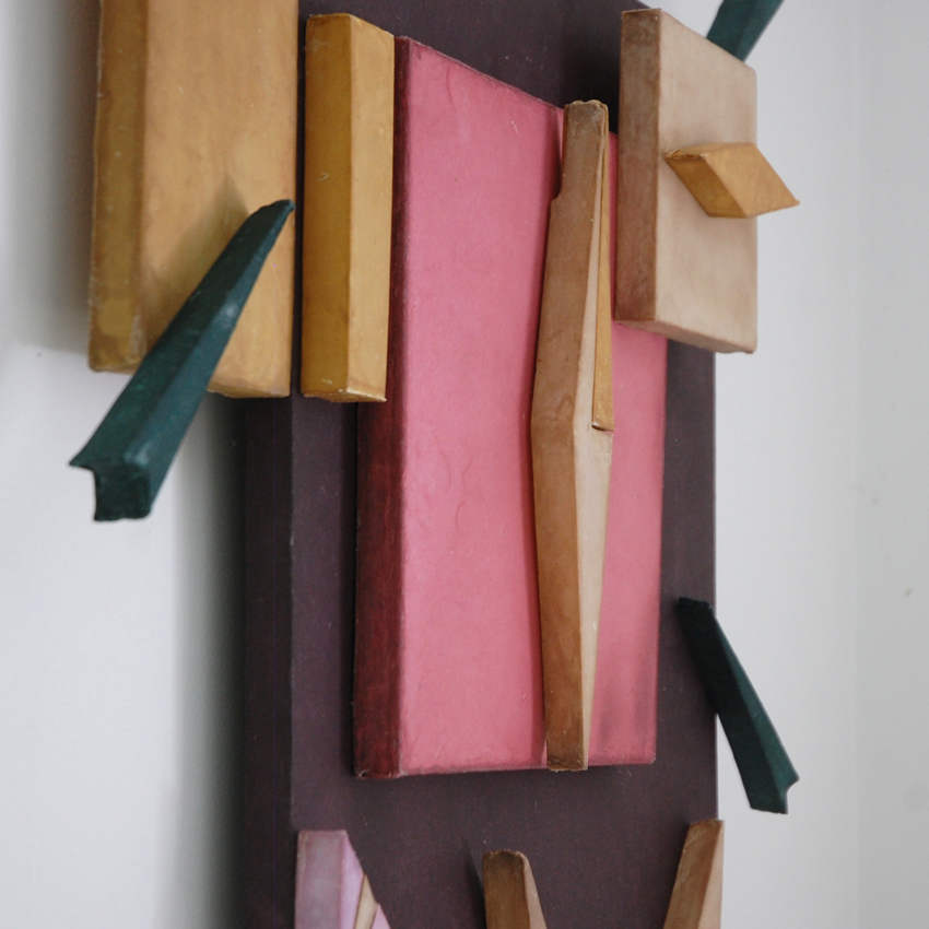 The individual elements of her sculptures, broad bases and oblique, tapered forms, are paper skins liberated from wooden armatures. They constitute three compositions, one of which she completely assembled during her Studio Workspace Residency in the papermaking studio.