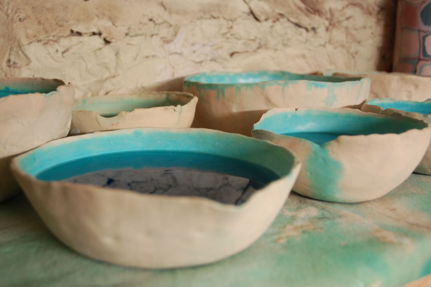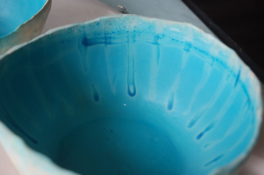 April’s residency began in the ceramics studio with white earthenware clay and a bag of blue Miracle-Gro pellets. This project builds on something she noticed in graduate school when a cup of liquid Miracle-Gro sat in her studio. After months it would not evaporate and it eventually crystallized. The question rose: if left to seep through a vessel wall, could this “glaze” bisqueware from the inside out?