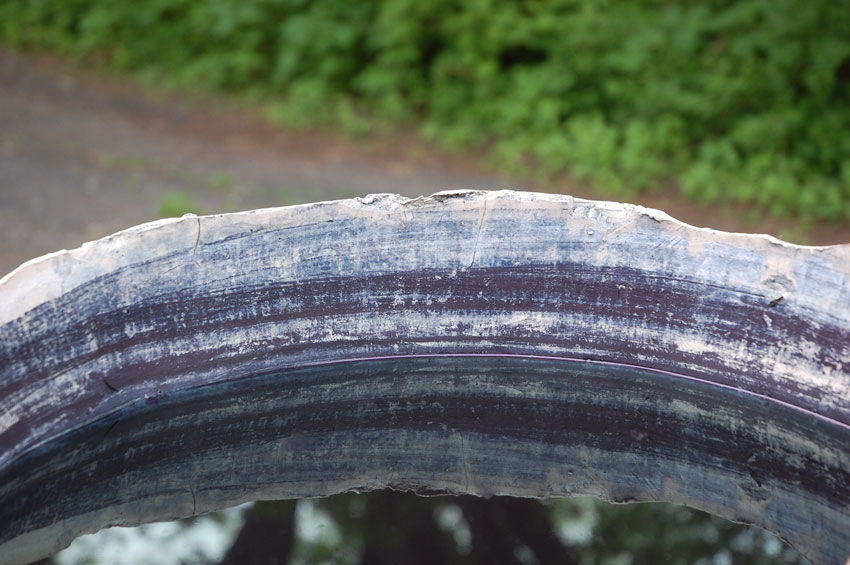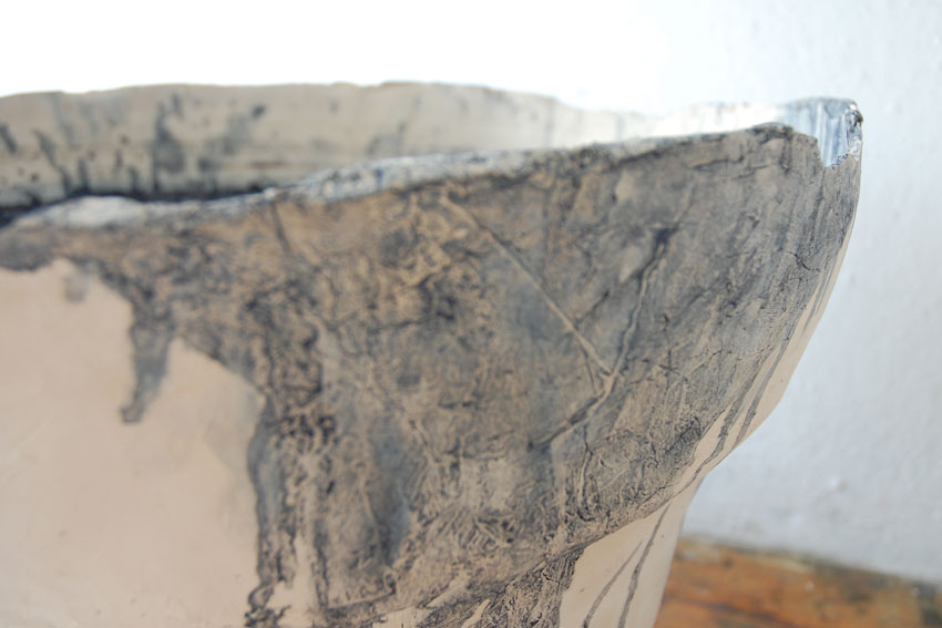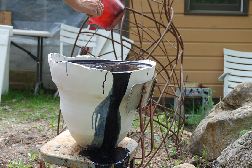 By coiling—the slow building up of clay in horizontal strips—and hand-forming, April made test bowls and two large vessels. Because of the time needed for crystals to appear, the latter were filled with indigo dye and placed out in the sun and rain. If left in similar conditions, one liquid could eventually expand while the other disappeared. Both would render the forms unusable by traditional standards, unsafe to hold food and water, but this function is not April’s intention.