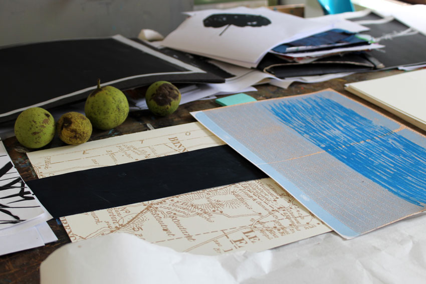 Off the paper and on the silkscreen printing tables, artist-in-residence Ewa Berg left several neat stacks of bright white paper and, next to them, extensive collections of source material—maps, ruled paper, Xeroxed plants—and most notably the season’s first fallen black walnuts. Working in the moment, Ewa would pay close attention to how her screen design and ink choice would play across each unique monoprint.