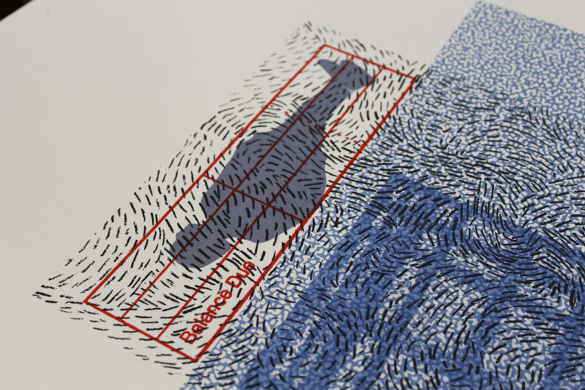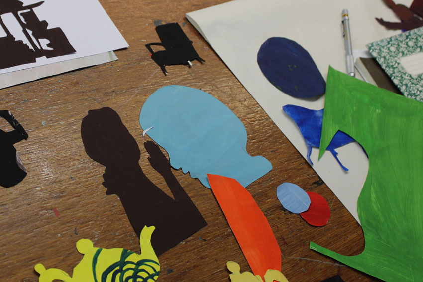 Halfway through our conversation, Ewa realized she accidentally said “overpainting” instead of “overprinting,” as both avenues in her practice connect through using color to flatten space. Her prints and paintings are populated by silhouetted figures and distinct details often pulled from domestic interiors; Ewa has entire series of outlines for teapots and chairs. The recent twist is the inclusion of office papers and templates mainly gathered from the dollar store and the Rosendale Library. Partly, they are unique to her time spent in America, slightly skewed from the measurements of products found in her home country of Sweden. Otherwise, these products allow her to integrate the rigid grids of business forms as a narrative device.