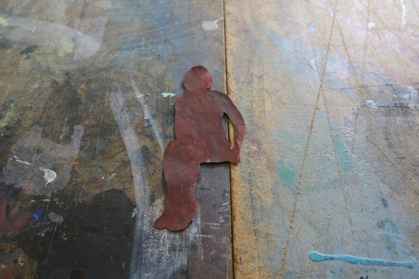 Between silkscreen and painting stands the natural intersection of collage—the middle ground of Ewa’s practice. Most of her figures live off the prints: her paper cutouts are often a stencil for silkscreens, but some are attached to the work later on. Although using these bare contours makes sense for planar medium of screenprint, it was curious that Ewa also employed this simplification with freehand painting. She explains that in this style, the scenes “can be read without having to read into details like a nose or eyes,” leaving gesture and stance as clues to the story.