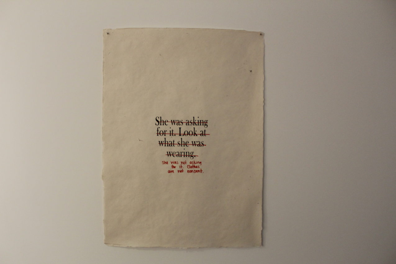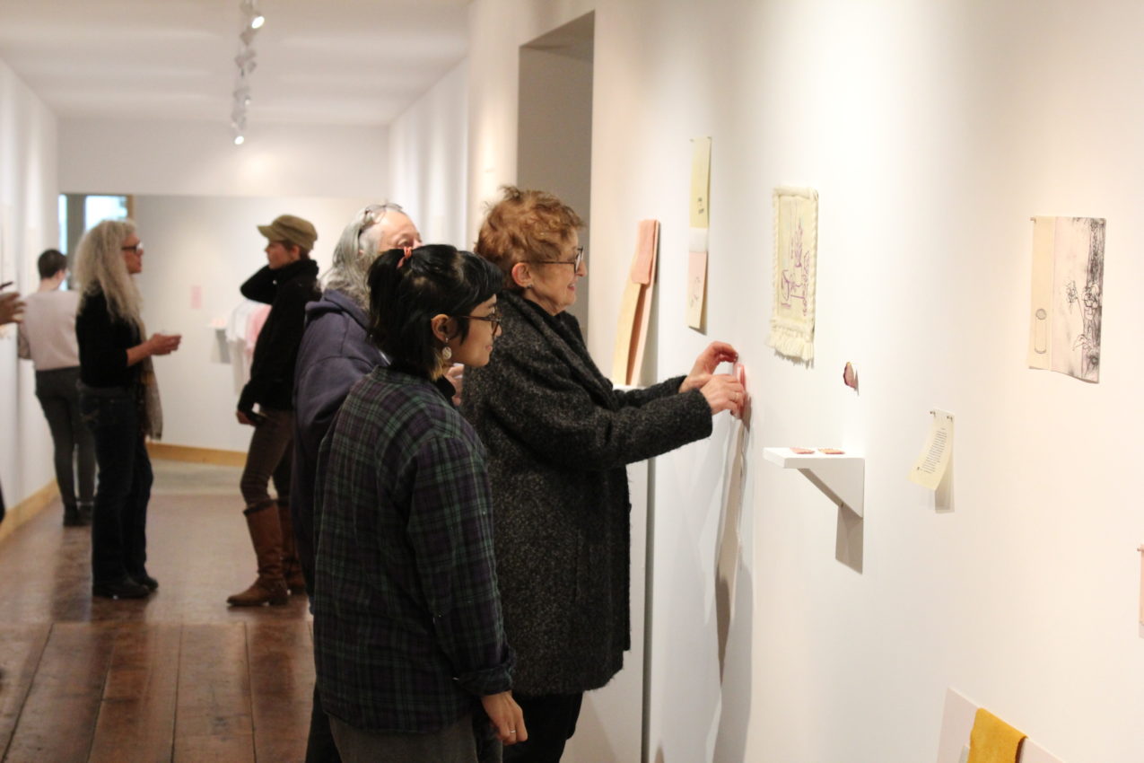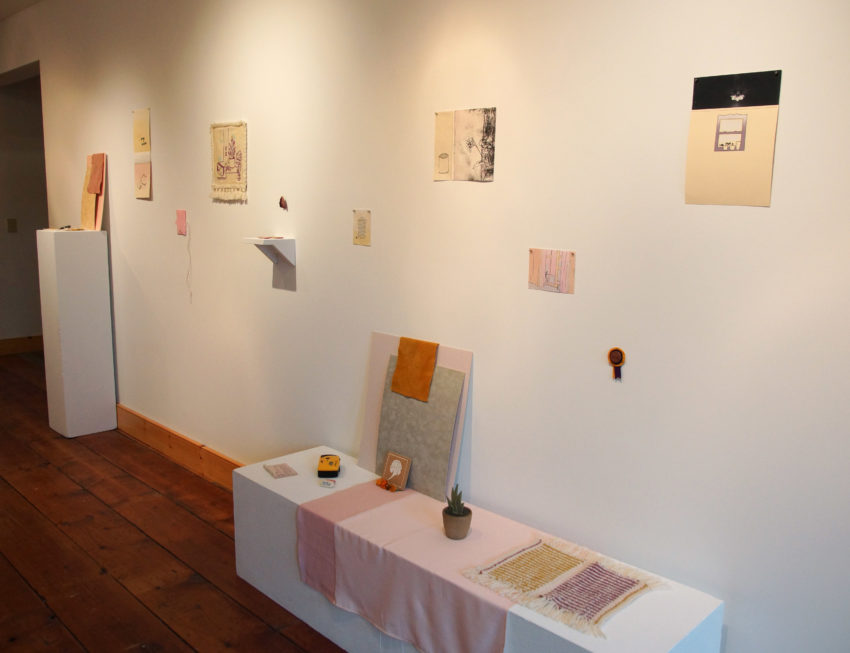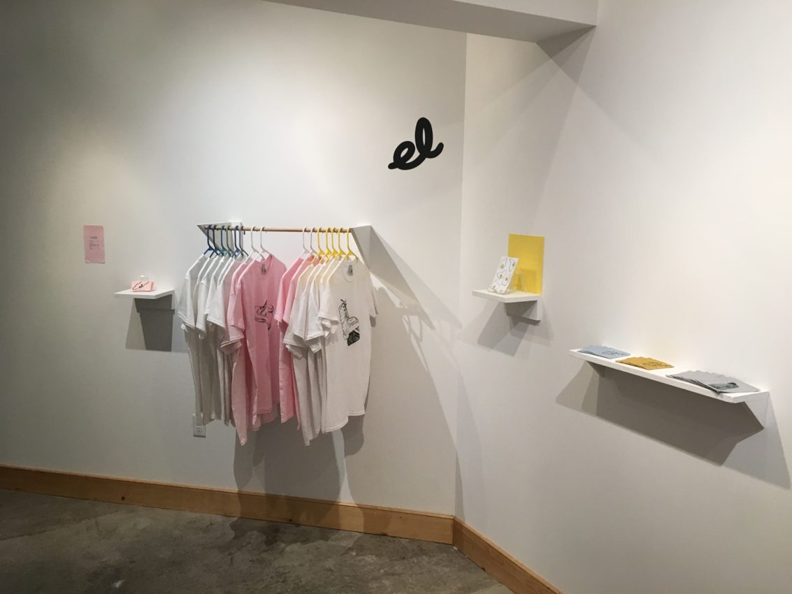 The show reflected these transfers, but occupied three distinct sections. Following the development of her brand, El built a small store of products, including stickers, silkscreened patches, and shirts. Along the hall, Morgan’s three foot tall screen-prints on handmade paper hung boldly next to a hand-bound book of leaves and poetry. Meanwhile, Serena created her own space of contemplation with a collection of small prints, sculptures, and memories installed next to the office stairs.
