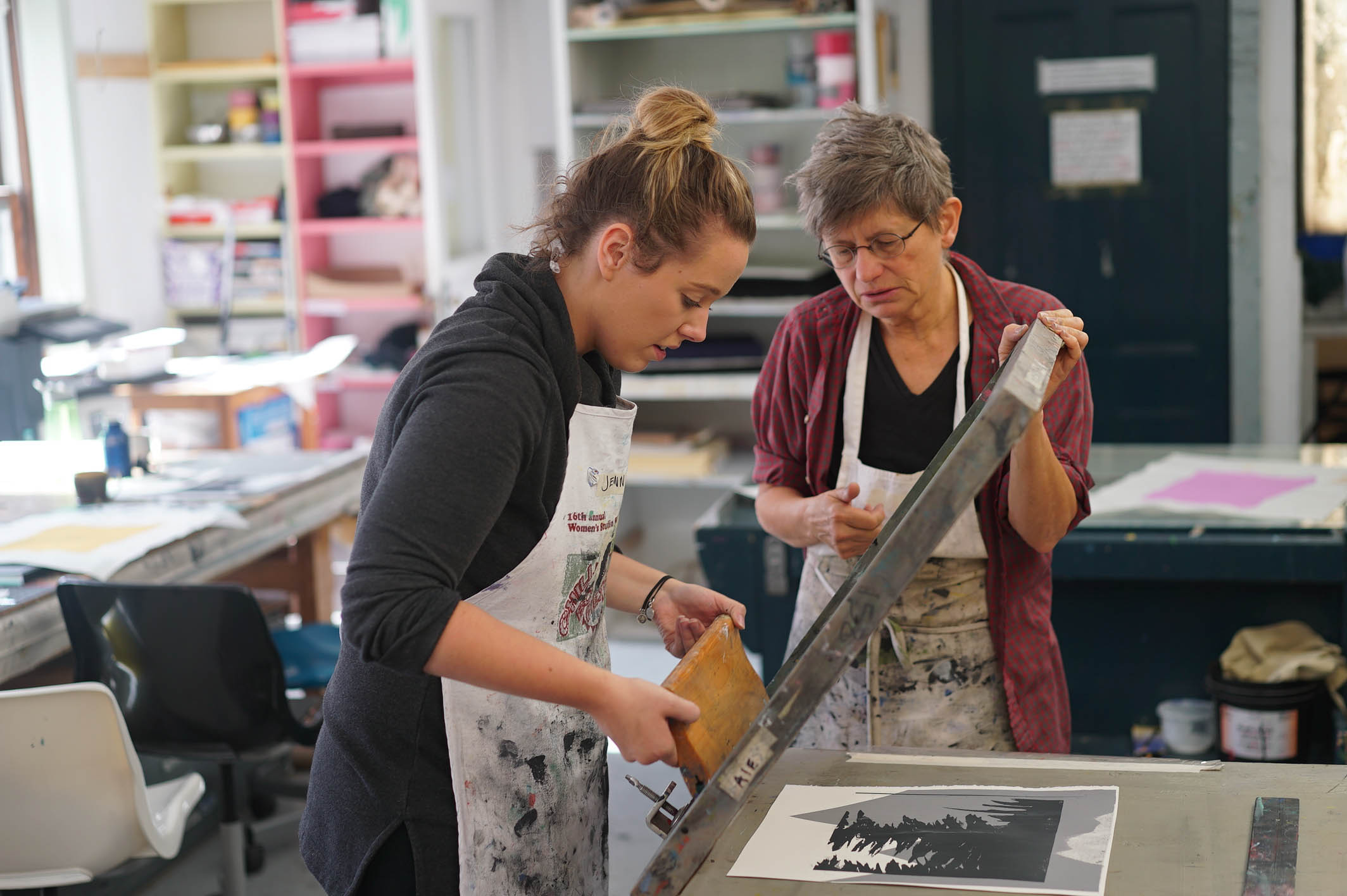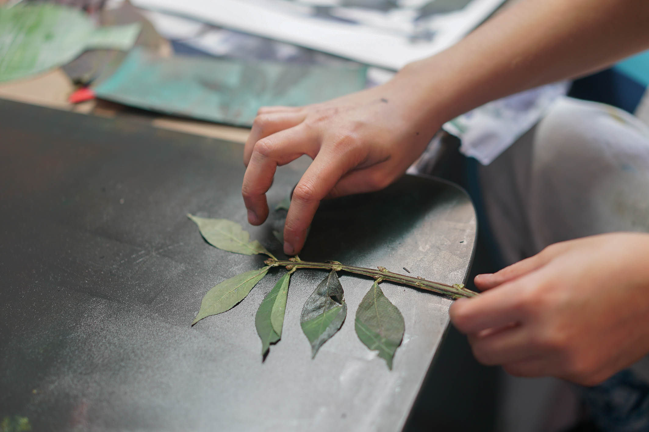 Rotating through disciplines in small groups, students focused on a different material every day and derived a new lesson from each one that extended beyond technique. They studied the material potential of fibers in papermaking, expanded their understanding of layered information in silkscreen, and tested variables as part of the monoprinting process in the intaglio studio.