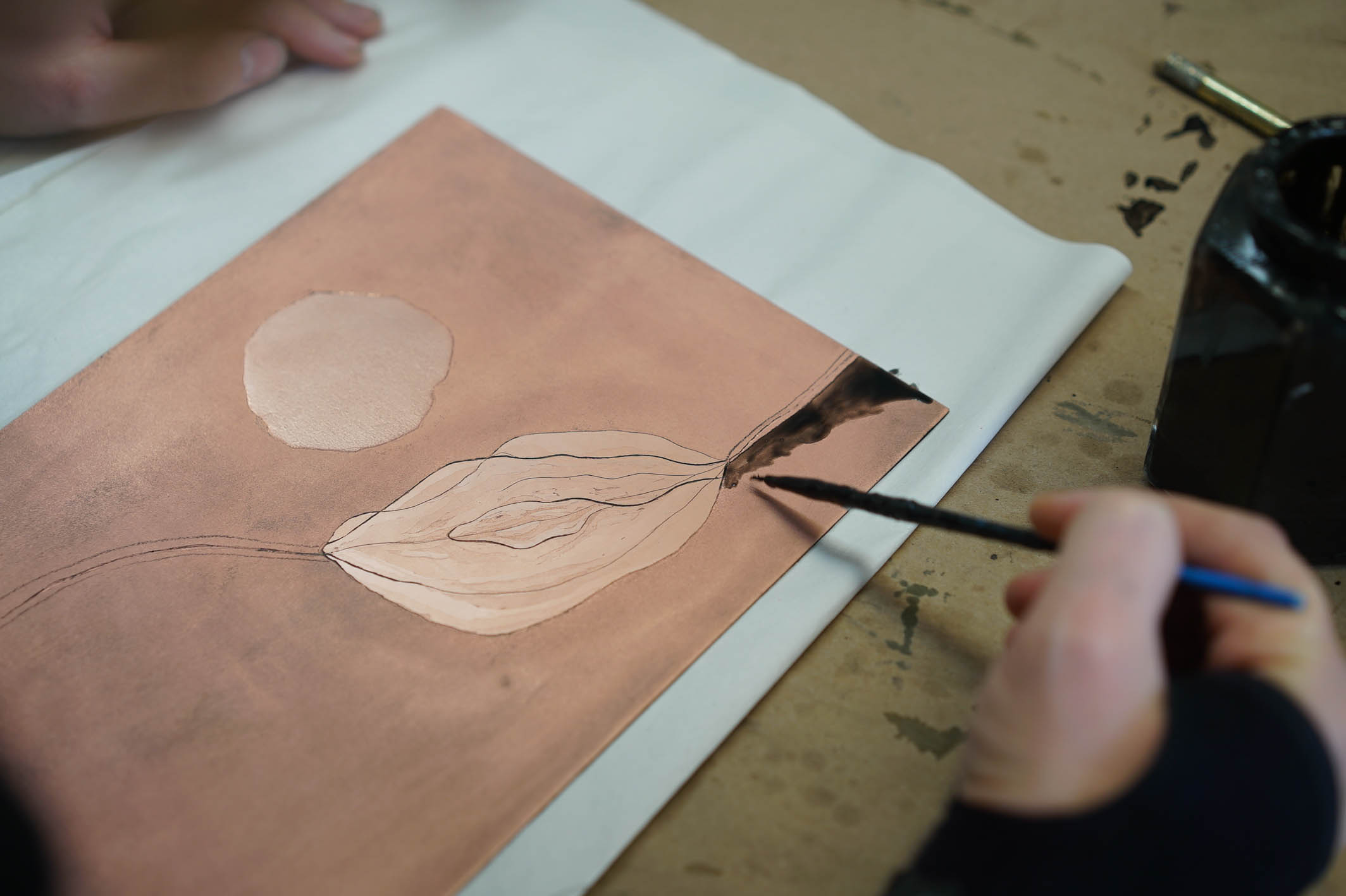 Once she’s carefully measured her paper, accounted for stretching, and soaked each sheet in water, she pulls out a freshly-inked copper plate. Knowing that this plate has taken hours of detailed sugar-lifting and diligent etching, what comes together at this stage is more than mere addition. Ewelina’s layering process is synergistic.