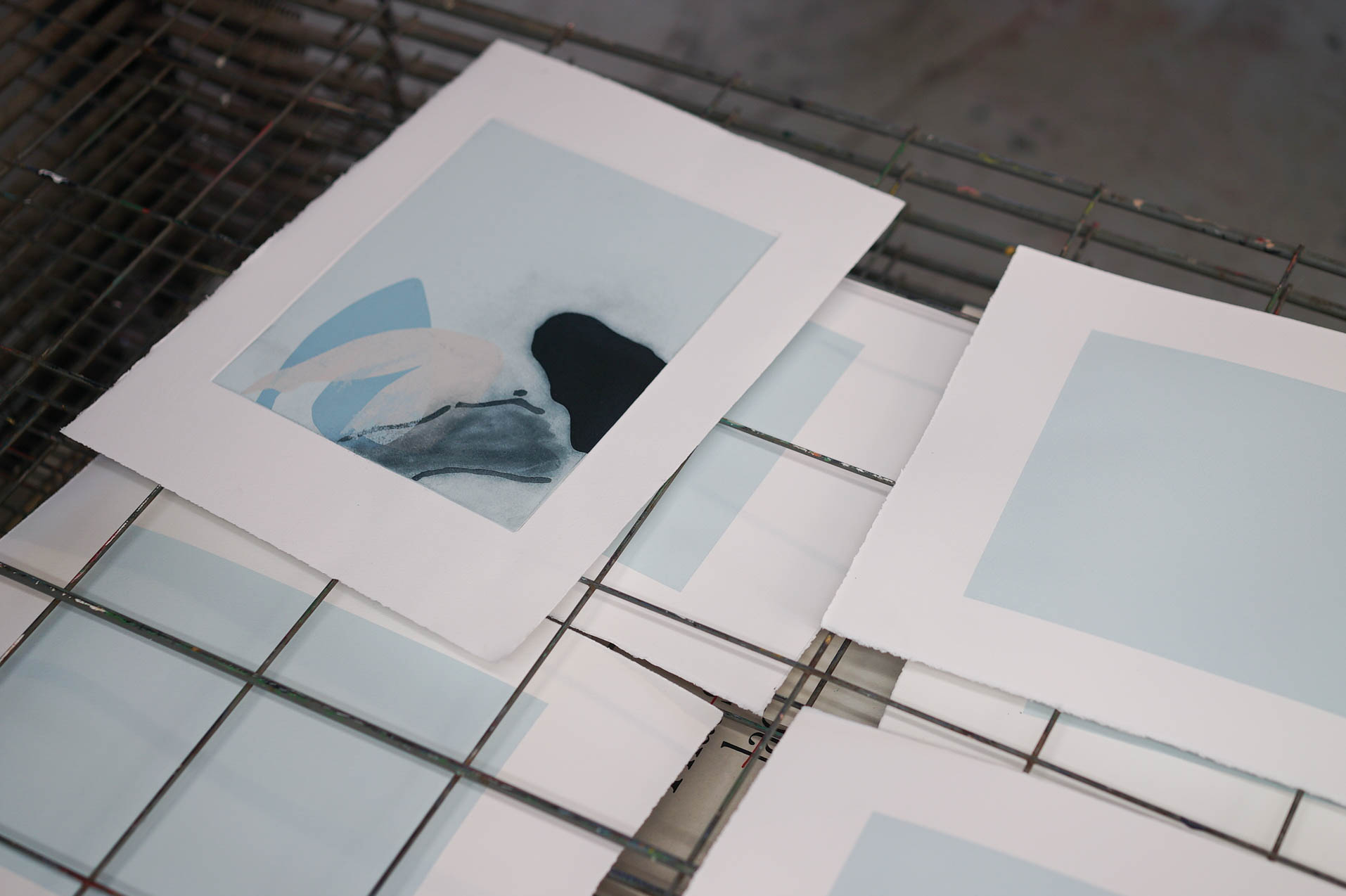 It’s the last week of her residency. Upstairs in our silkscreen studio, Ewelina begins each print with a backdrop of bold, matte colors and abstract shapes. Some of these shapes suggest body parts, but this comes into full clarity only after she’s added the final layer.