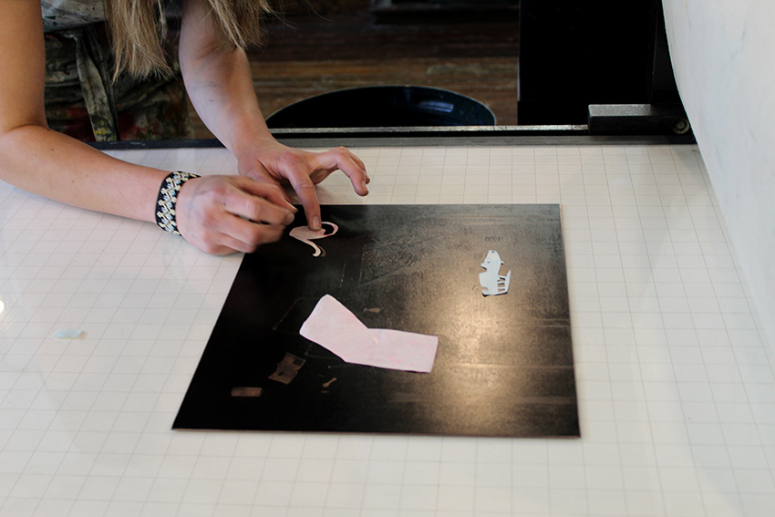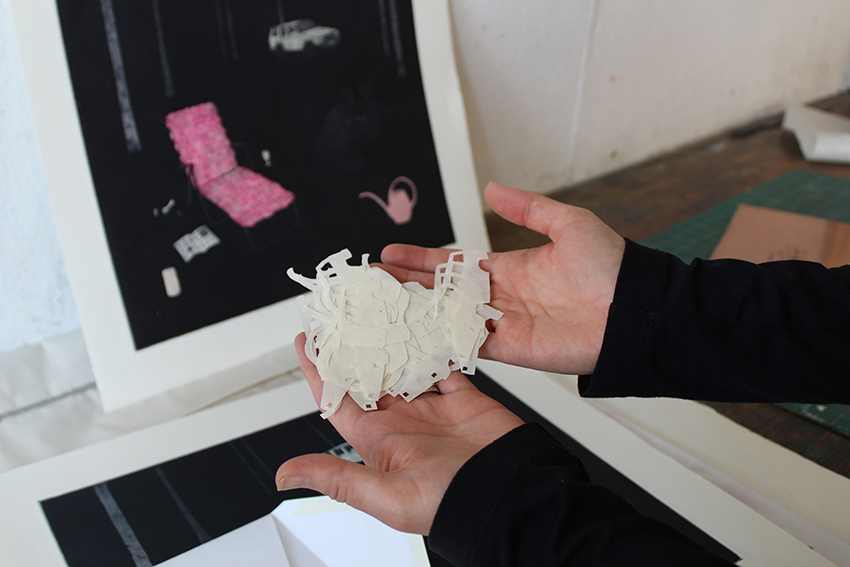 Fragmentation runs through both subject and composition, as a prominent line of Karinna’s practice lies in collage. Paper helps her discover new subjects by working more directly and loosely, and in her home studio. Using hand cut chine-collé paper tinted with pastels, she adds select colors into her otherwise monochromatic works. It’s an continuous experiment, a conversation between shapes expressively cut—almost like brushstrokes—drawings meticulously executed as prints. She’s interesting in further blending the two styles, and is still exploring the uncertain middle ground.