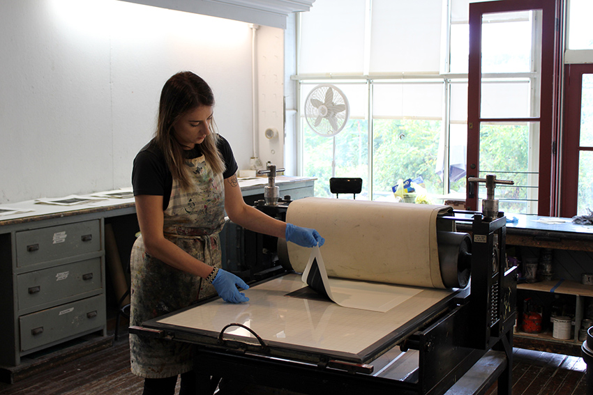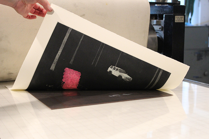 With a “little abstract, little documentary” printing practice, Karinna came to WSW’s intaglio studio to expand her “Break Up” series of etchings that captures glimpses of her life in Fairbanks, Alaska. Her residency coincided with a turning point: afterwards she moved farther south to Anchorage after living six years just a few hundred miles from the Arctic Circle. Series specific to time and place are found from Hiroshige’s One Hundred Famous Views of Edo to Berenice Abbott’s shots of 1930s New York City, and well beyond. For Karinna, who is refining how she uses tone and color in her prints, the characteristics of high latitude spaces complemented how she can control the appearance of light on the etching press.