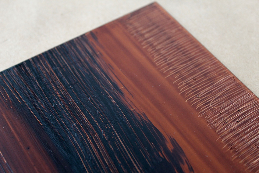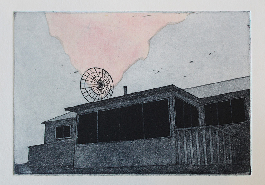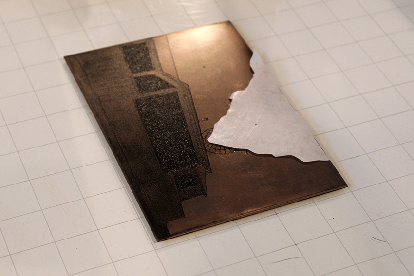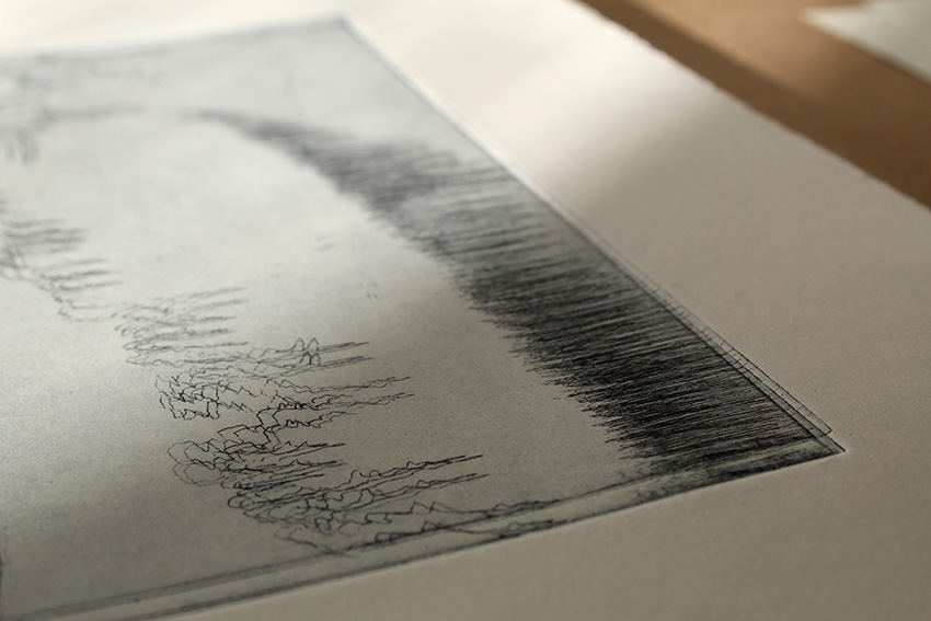 On her copper plates, the care with which Karinna Gomez treats her line work is evident across the aquatint grain. We see it in the way an electrical cord coils on the ground and the pattern of a lawn chair’s webbing. Another print, Goldstream Drive, shows sketched lines printed several times with the plate moved slightly each run. At another point in her Studio Grant Residency, Karinna printed the backs of two etched plates just to see how the unintentionally gathered shapes transferred to paper.