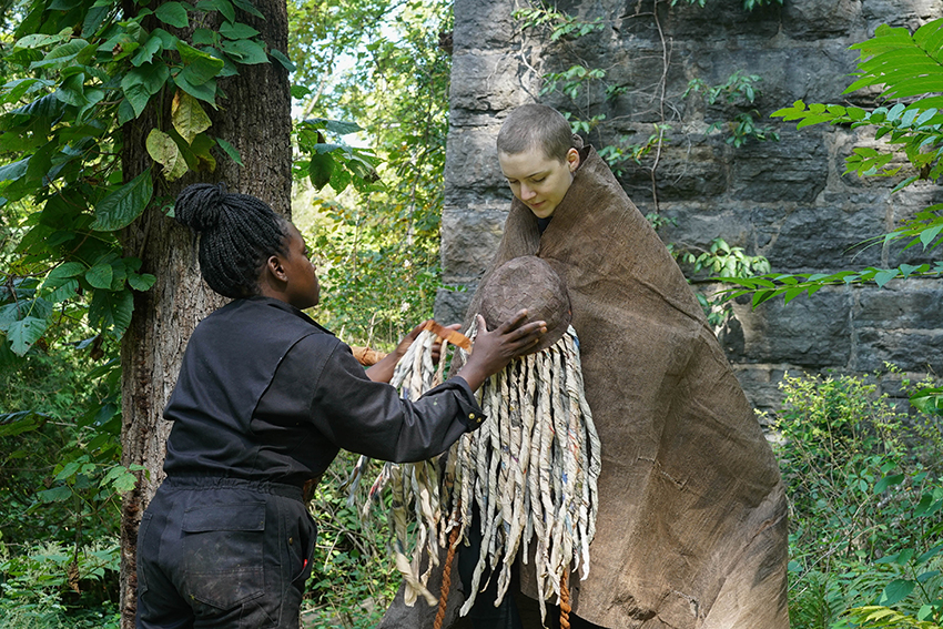 Sheila Nakitende, standing where the WSW campus meets a grouping of long inoperative cement kilns swallowed by the woods, covered El Horsfall’s face with a headdress. She chose this spot with the rock wall and overgrown fronds to stage an impromptu photo shoot. Shortly afterwards the project, sans model, was installed in the gallery.