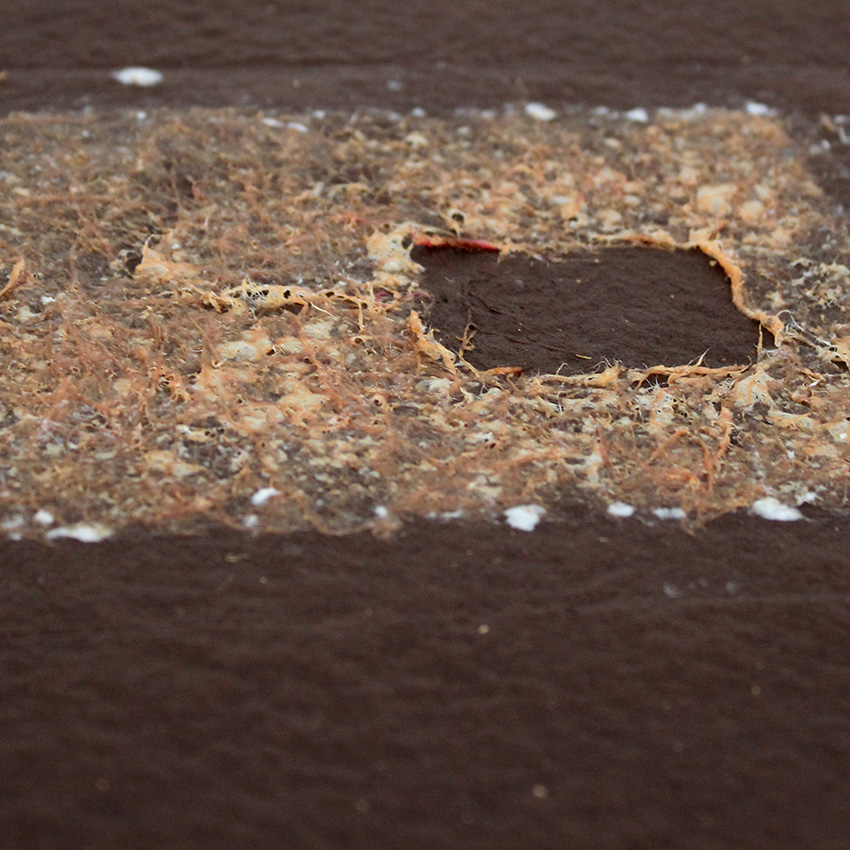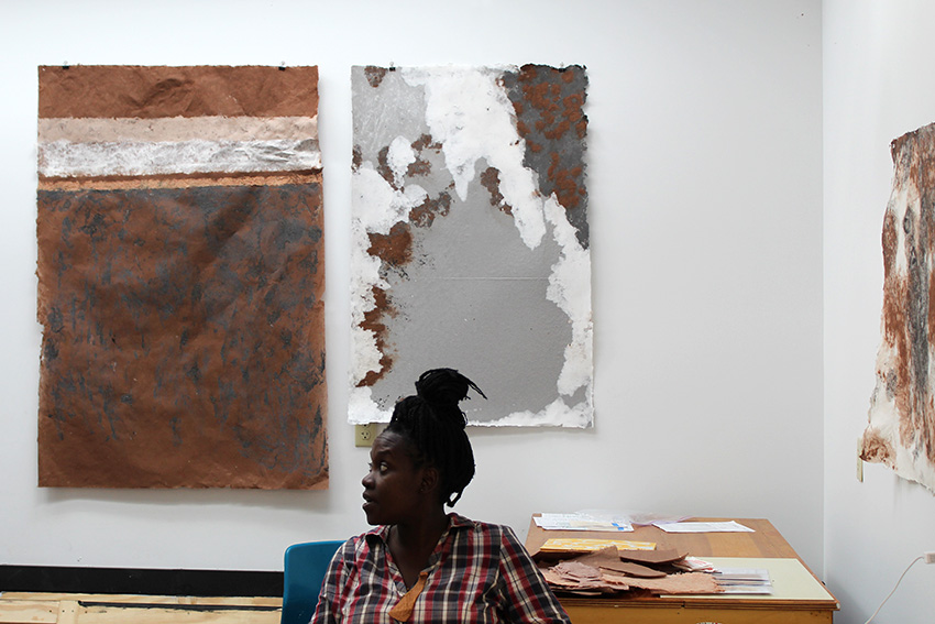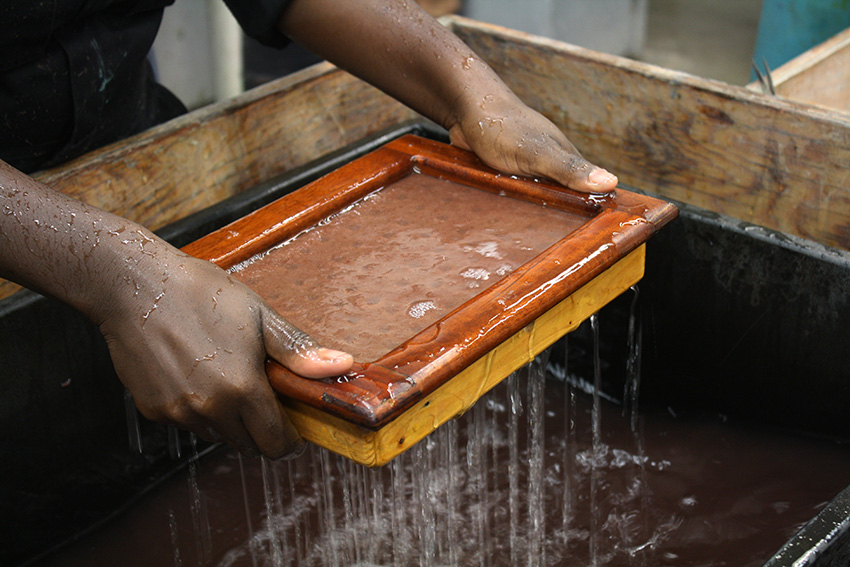 For her residency, Sheila arrived with sisal rope and barkcloth, formed when soaked Mutuba tree bark is repetitively pounded. Cuttings of bark can turn into yards of coarse fabric, providing renewable material without killing the tree. Sheila further processed the sisal and barkcloth to shorten the fibers using both with the mechanical beater and with handheld mallets. Finally, she mixed different ratios of pulp together then, during a month of pulling, pouring, couching, and layering, carefully recorded the results.