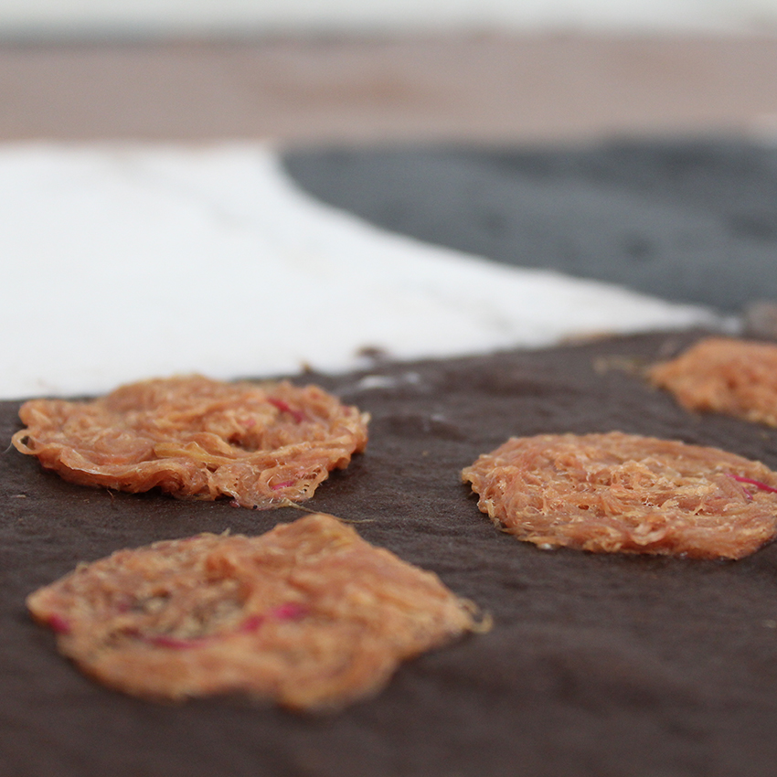 After taking on this larger-than-life project, Sheila scaled down her work only to build it back up again in the paper studio. Her Parent Grant Residency was committed to practical research of contemporary hand papermaking techniques, first learning to pull Western-style sheets then creating larger, installation-sized works with barkcloth that she brought herself, cotton, and abaca. Immediately, she had surprising results: water drained through the barkcloth fibers so quickly that the pulp had no time to settle in the mould.