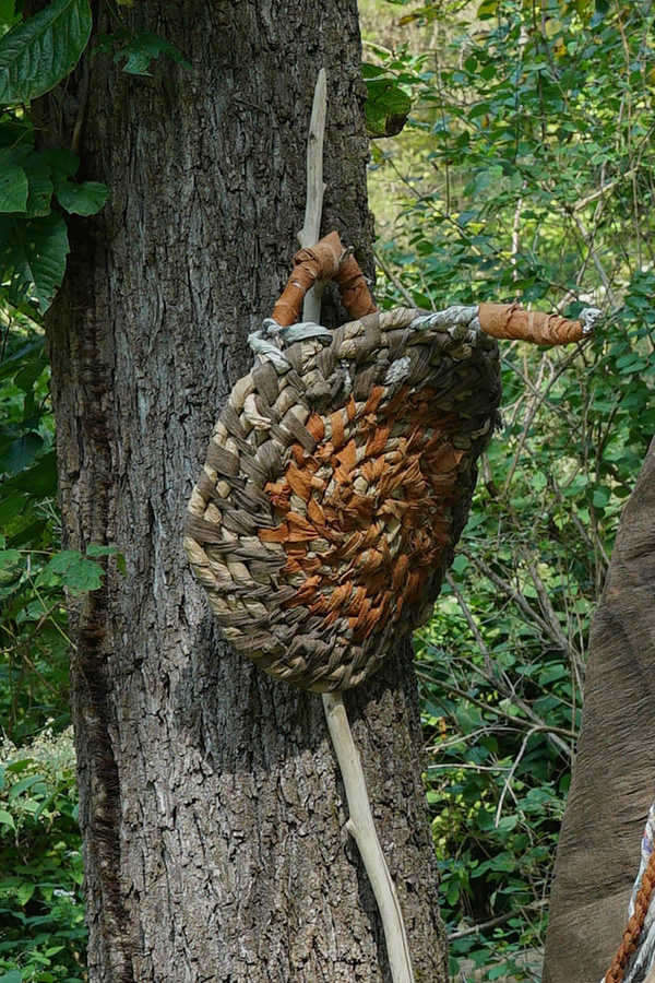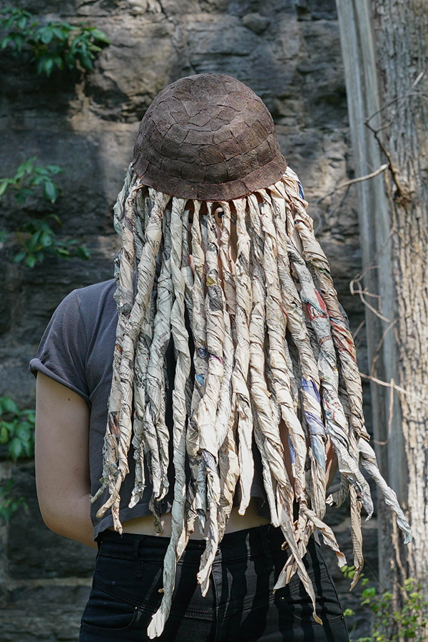 The ensemble, made with folded, woven, and twisted paper repurposed from the studio recycling bins, consisted of a mask, a shield or satchel of sorts, and a meticulously sanded walking stick. For a final touch, Sheila wrapped El in a long sheet of barkcloth, a material specific to her home in Uganda. Costumery’s place between craft and performance could neatly symbolize Sheila’s own approach to artmaking, but we would be left with one problem.