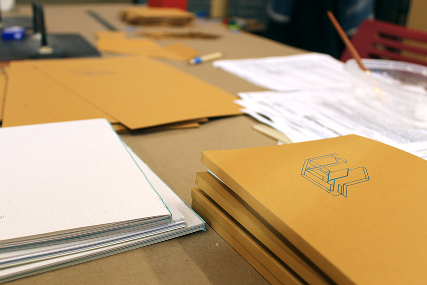 Catrin’s Artist’s Book Residency Grant project is composed with three digital, photocopied, and hand-printed works: Typologies, a pamphlet; Studies, a screenprinted poster; and A Study, an illustrated essay bound in the book’s core. Studies for Studies is not a book we can leaf through once. A Study contains seven discrete sections with interlocking references all held together by tape binding. The moving pieces of Typologies and Studies, attached to the front and inside covers respectively, reveal the symbols, dates, and spaces that form the basis of the essay.