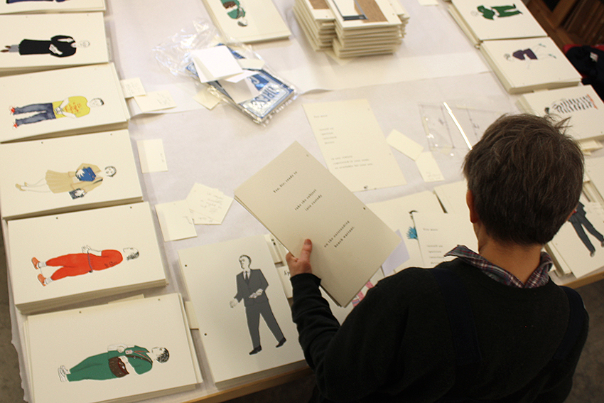 Fifteen hand-drawn characters—ranging from officials to inmates—are printed and bound in an edition of 75. On the spread’s right side, they are divided into a head, torso, and legs in the style of mix-and-match books. Opposite an image is a sentence the person would either say or hear in court. These sentences become more absurd when creating new combinations of people. Readers can turn the declaration (page not shown here):