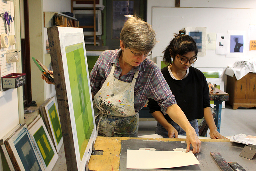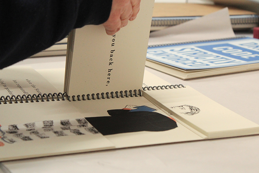 Tona has served as a Spanish language interpreter in the New York legal system since the mid-90’s, translating her own experience into paintings, prints, sketches and one other handmade publication. With a public consciousness so often focused on federal judges who rule on sweeping state or national policies, she pulled her audience’s attention to the courthouse closer to home. This past fall she joined WSW for her second Artist’s Book Residency, also teaching in the Art-in-Ed Program, to make her book Dress Code Strictly Enforced.