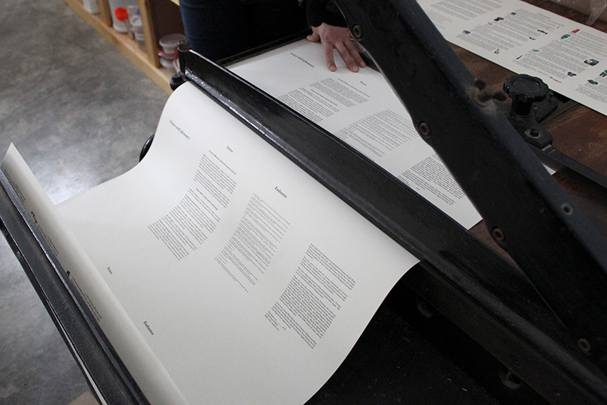 When on a job, Tona’s in the company of social workers, prosecutors, judges, and countless others who pass through the courthouse door. She walks us through this portal as well using a blue, spiral-bound artist’s book with screenprinted images and text. On the inside cover we’re met with a metal detector in a room of wooden paneling, drawn from her time in town courts. Page one greets the reader with an officer warning them to turn off their phones.
