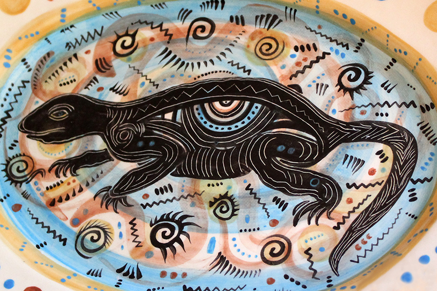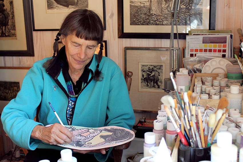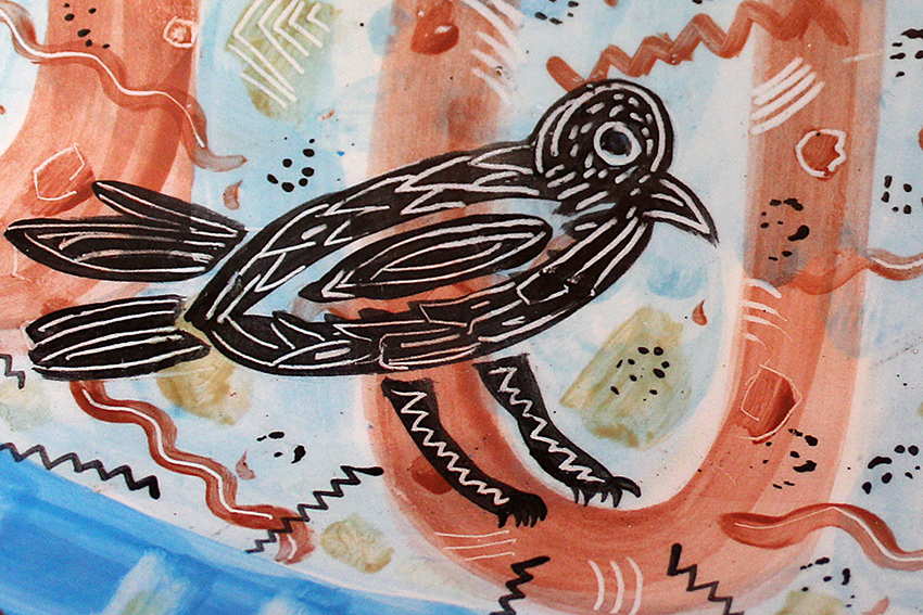 The nearly-mythical figures that seem to dance across Annie’s pottery took time to find their way from paint to ware. After the Workshop relocated, Margaret Henkels began holding small ceramics classes outside. WSW had yet to acquire kilns or a clay studio, but the group found ways to grow their program with pit and raku firing. These pieces, carefully burnished with cloudy, smoldered surfaces, still sit in Annie’s living room. She was hooked: “Whenever I would dream about making art, it was always ceramics.”