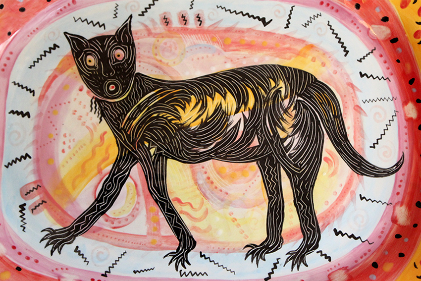 A vast collection of art from her travels, mainly in Mexico, informs the painted figures and animals she creates with short brushstrokes and seals with a layer of glaze. It’s poised against brightly painted walls all throughout her house, interspersed with an abundance of small sculptures, plants, toys, textiles, and photographs. Looking at the colorful home she made, there is no question that her style develops from a deep appreciation of the visually compelling world around her. When art is, fundamentally, people “repeating the same themes, but adapting it to their own sensibility,” she unapologetically draws an aesthetic of abstracted characters and creatures against painterly polychrome designs.