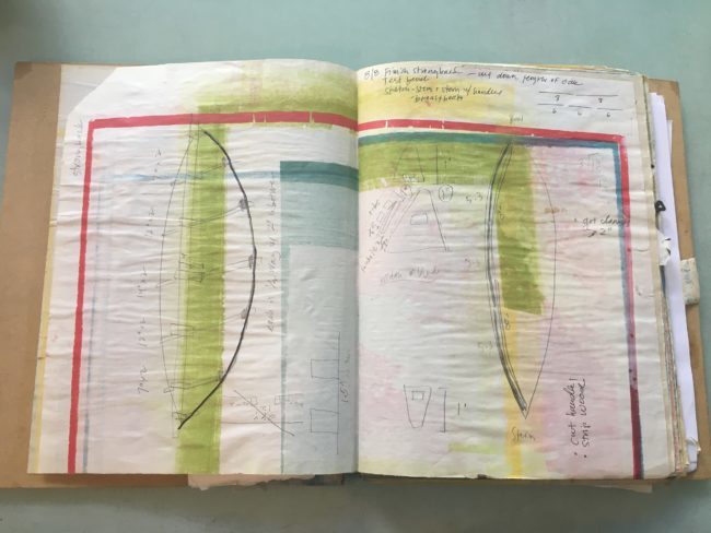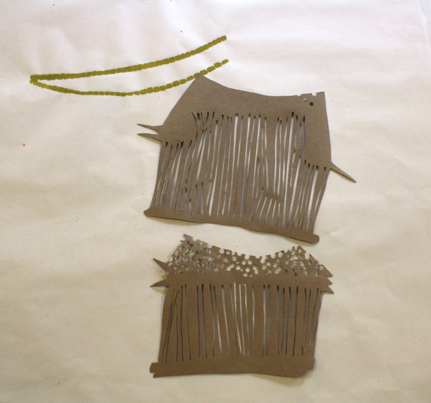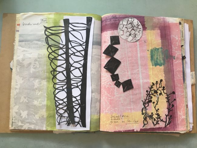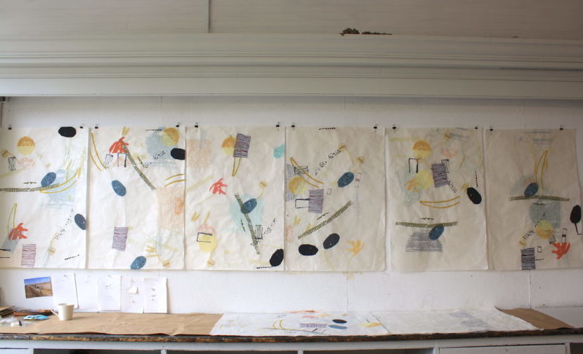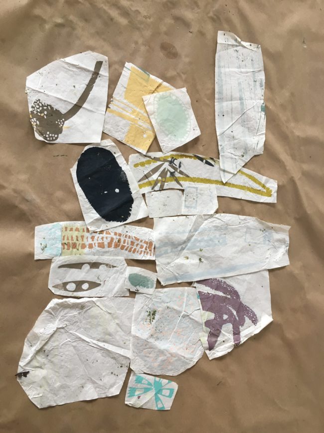 Moore’s prints are abstracted enough to be viewed on their own, but knowing the context in which they are made opens the door to big picture questions about the environment and our relationship to it, “I hope that people will feel connected to their surroundings, to their place whatever it is, and therefore develop some sort of environmental conscious.” During Open Studio, Moore constructed a loose structure out of her test prints on the back porch. Strung together on lines, swaying in the breeze, book artist Maureen Cummings comments “they look like prayer flags for the wetlands.”