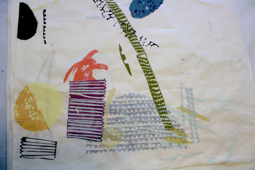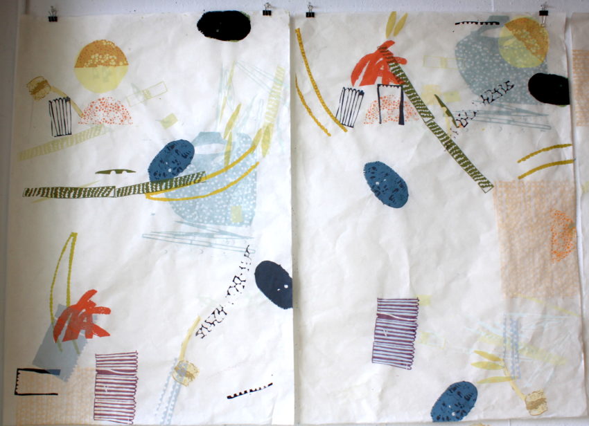 By design these prints evoke the feeling of looking through a microscope. On large sheets of Thai Kozo, shapes become recurring characters that drift across the page—they intermingle and cluster then float apart. To see all of them together creates a sense of movement, of life suspended in water. Printing on both sides of the paper, muted colors emerge and are overlapped by bold ones, creating the illusion that figures are coming in and out of focus. This series is playful and colorful, the compositions are scattered yet retain a sense of balance, “I think the playful quality has to do with getting people excited about their own backyard and feeling connected to nature in some way” Moore explains, “it helps evoke a sense of curiosity and wonder in the world.”