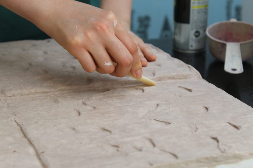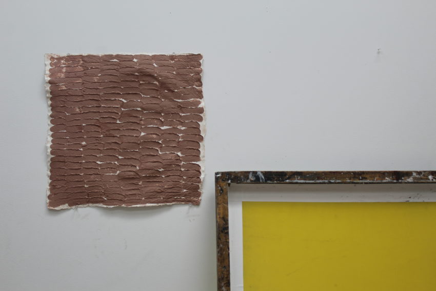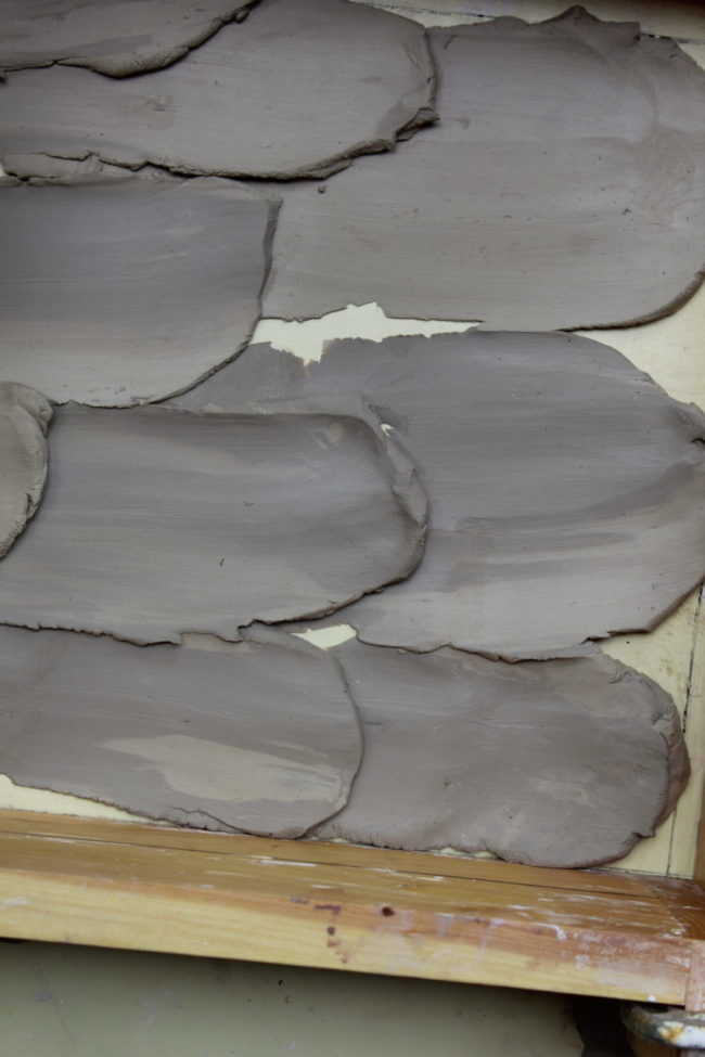 Using paper as a structure to hold a layer of clay, repetitive marks pattern themselves across the surface. “The first things I notice are color and texture” she explains, “these are inspired by the texture of old walls and peeling paint.” Using her hands and fingers to make gestural and semi-uniform marks, the absence of imagery highlights the material itself, showing us their unrefined but elemental qualities that are, as she puts it, “the touch of the material.”