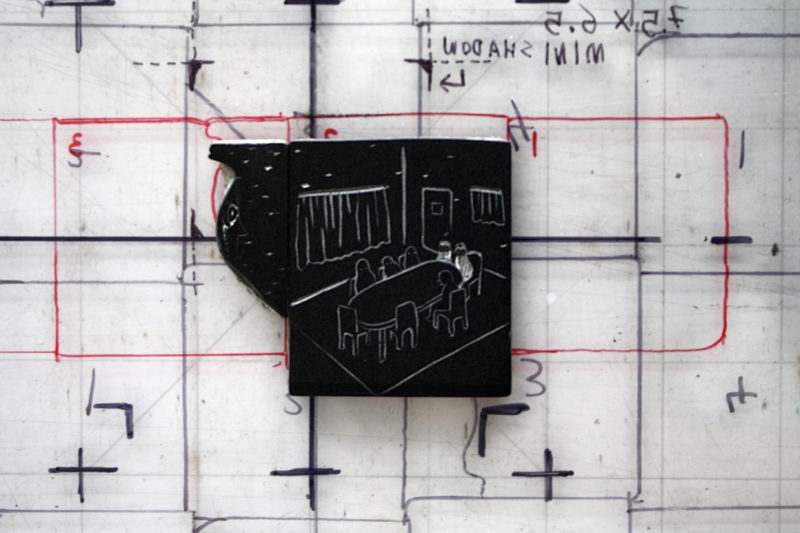 While You recounts dreams, memories, and stories, the narrative complexity develops. Small, surreal comics describing existential dread take place in minimal settings. Repetitions of the same print evokes time passing as the linoleum loses ink or becomes damaged through repetitive printing. This is clear in the print “In The Shower”. The figure tilts their face straight up into a pressurized stream. As time passes, the water erodes facial features until nothing remains but a white silhouette in an increasingly propulsive cascade, finally resembling a comet in space shooting through the dark with a long celestial tail. You works small, bent so closely over her linoleum squares, her glasses almost come in contact with the sharp edged tool in her hands. “By adapting one of the traits in printmaking—images that can be reproduced multiple times—I wanted to share my memories that have come back to me again and again.” The effect is like watching the image undergo some contained life cycle on a cellular level as each piece of the grid evolves over time. The process of building these stories happens in layers. Carefully placing the linoleum squares ink-side up on the grid, You begins to map out the changes she will make in each carving and the changing relationships between the figures set in ink.