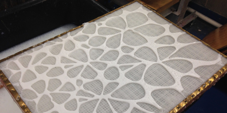 This class will cover the basics of papermaking with an emphasis on surface exploration. We will focus on methods to create imagery within the sheet covering techniques related to embedding, watermarking, and blowouts. Participants are encouraged to experiment as they consider multiple approaches to each process working with stencils, dimensional drawing, and even physical objects to create images and leave impressions. The product from this class may range from stacks of experimental sheets, to a series folio editions, or pieces that may be developed further through drawing and printmaking outside the workshop.